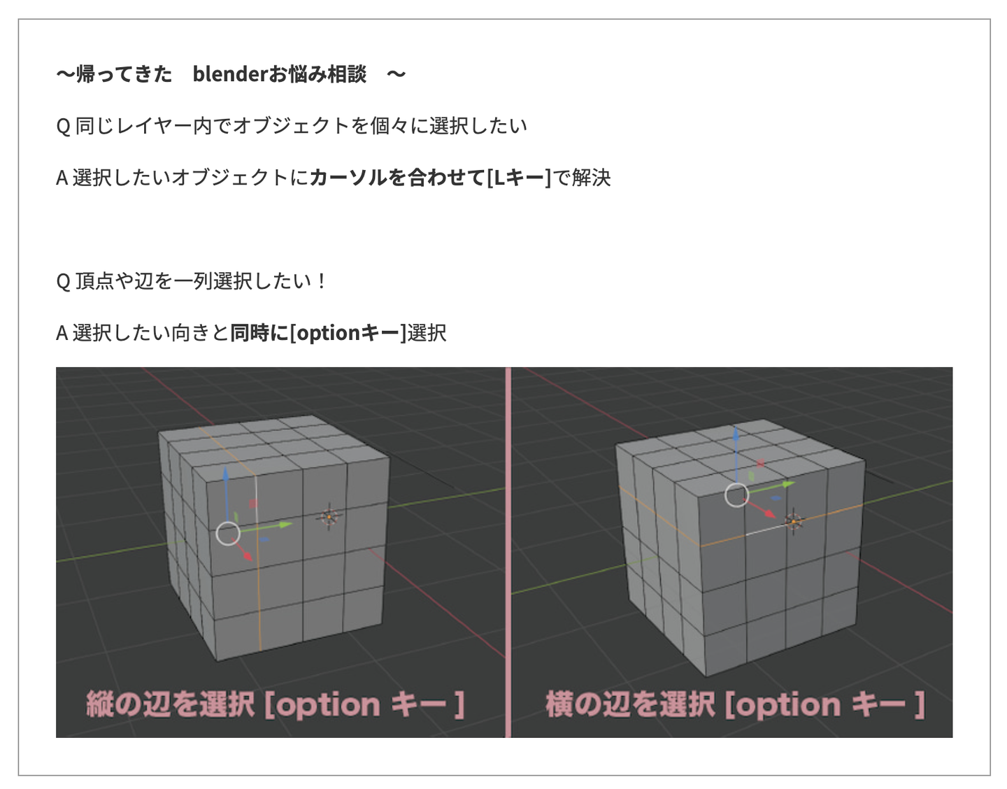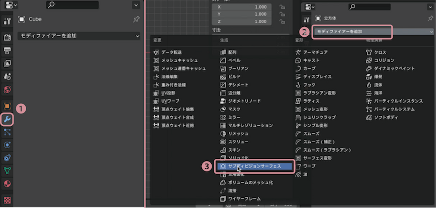 ① 立方体を追加してオブジェクトモード[Tabキー]で※1細分化を適用[Command + A]