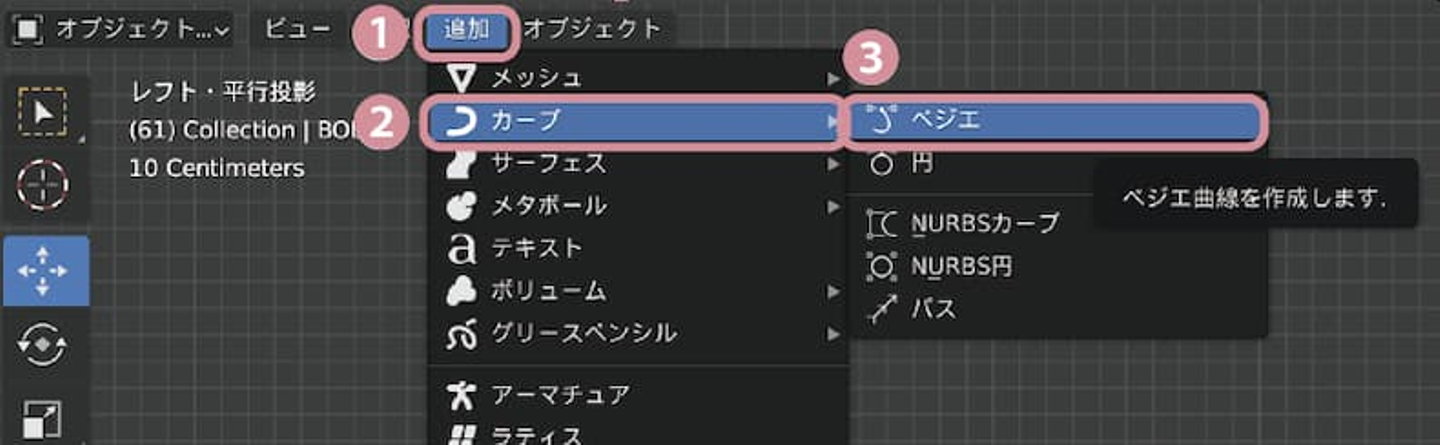 オブジェクトモード [Tabキー] → 追加 → カーブ → ベジェ を選択