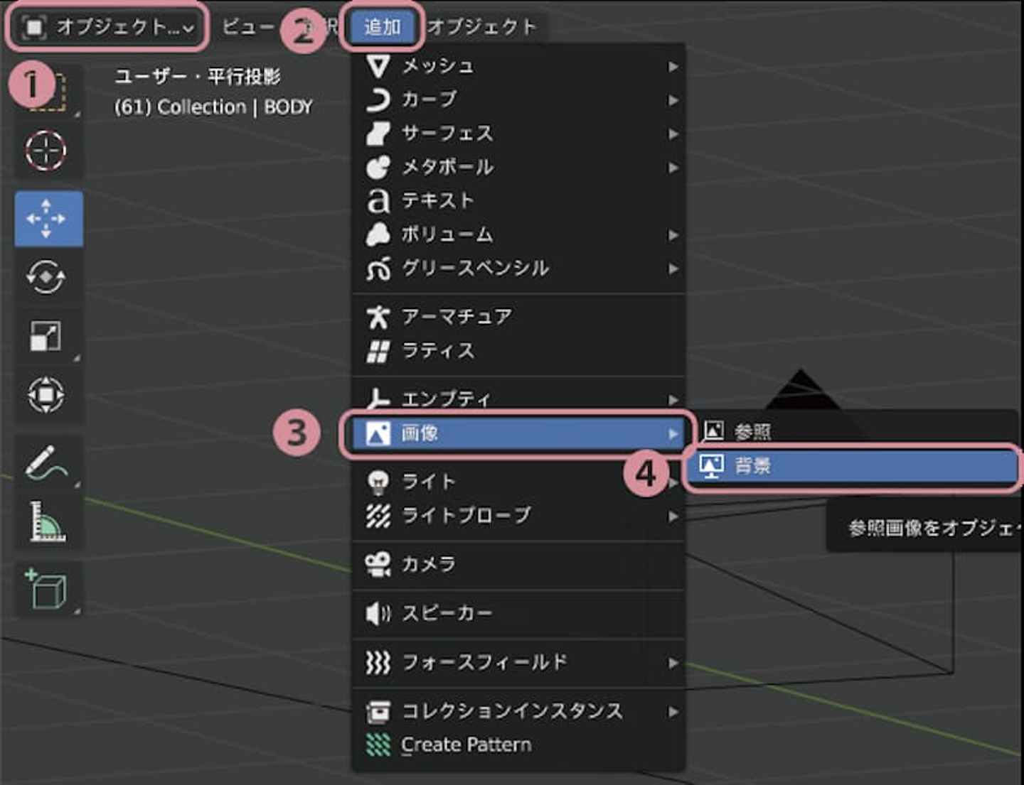 次に画像のようにオブジェクトモード [tabキー] → 追加 → 画像 → 背景 で前の画像を選択