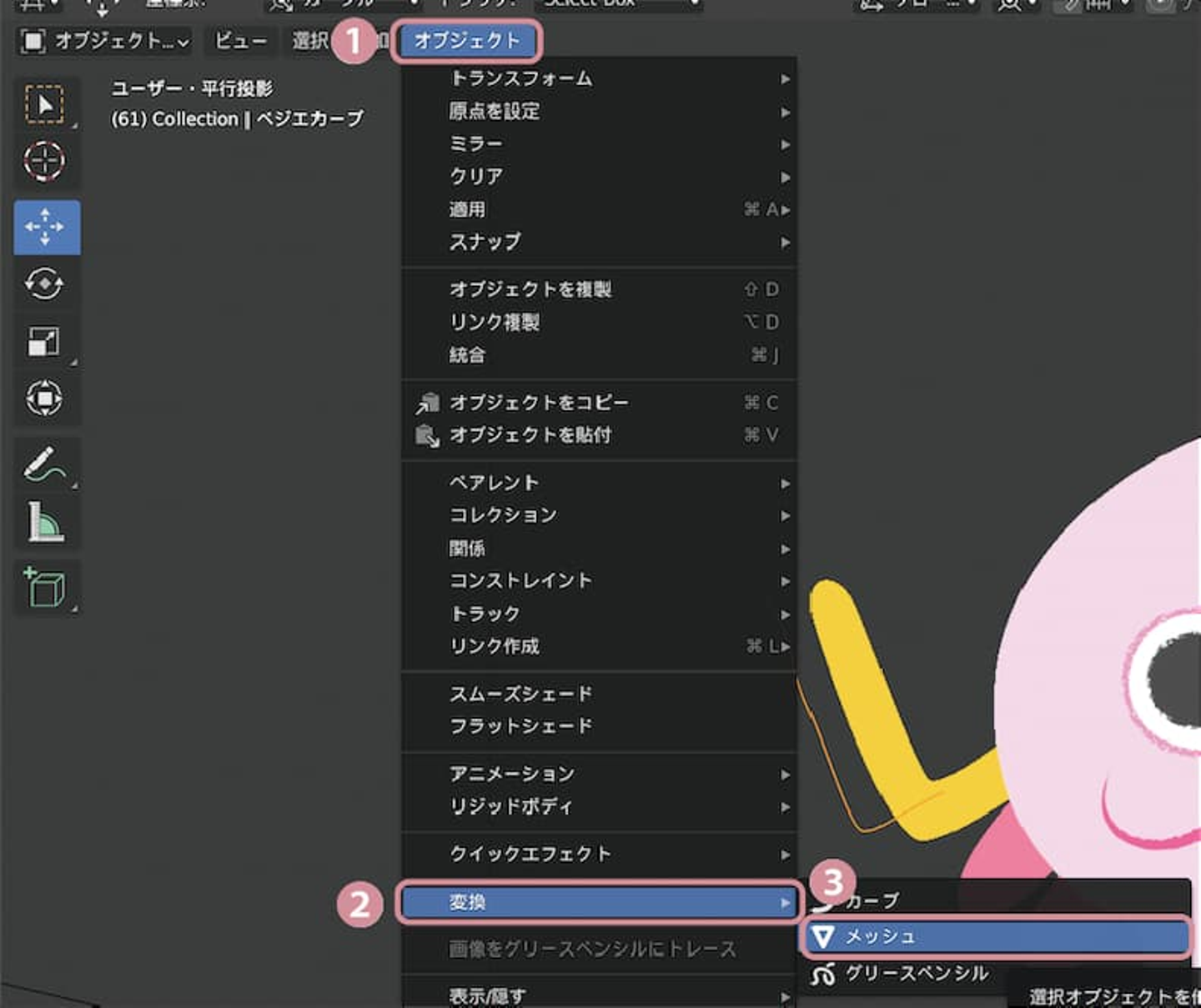 ② オブジェクトを選択してUキーで展開のメニューが開く
