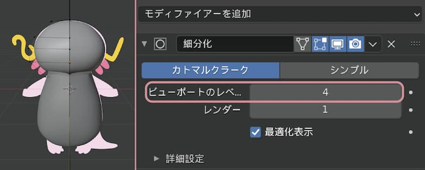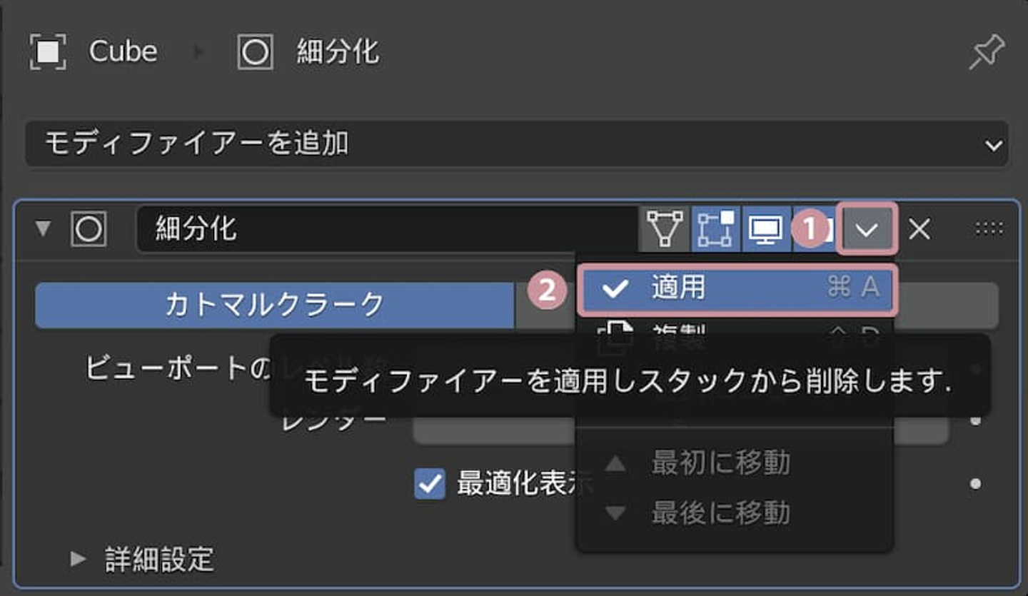 ② モデファイアーのサブディビジョンサーフェス(細分化) を追加