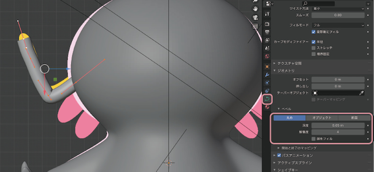 このままだとただの線なので、「ベベル」の「深度」の数値を調整して厚みをつけてあげます。