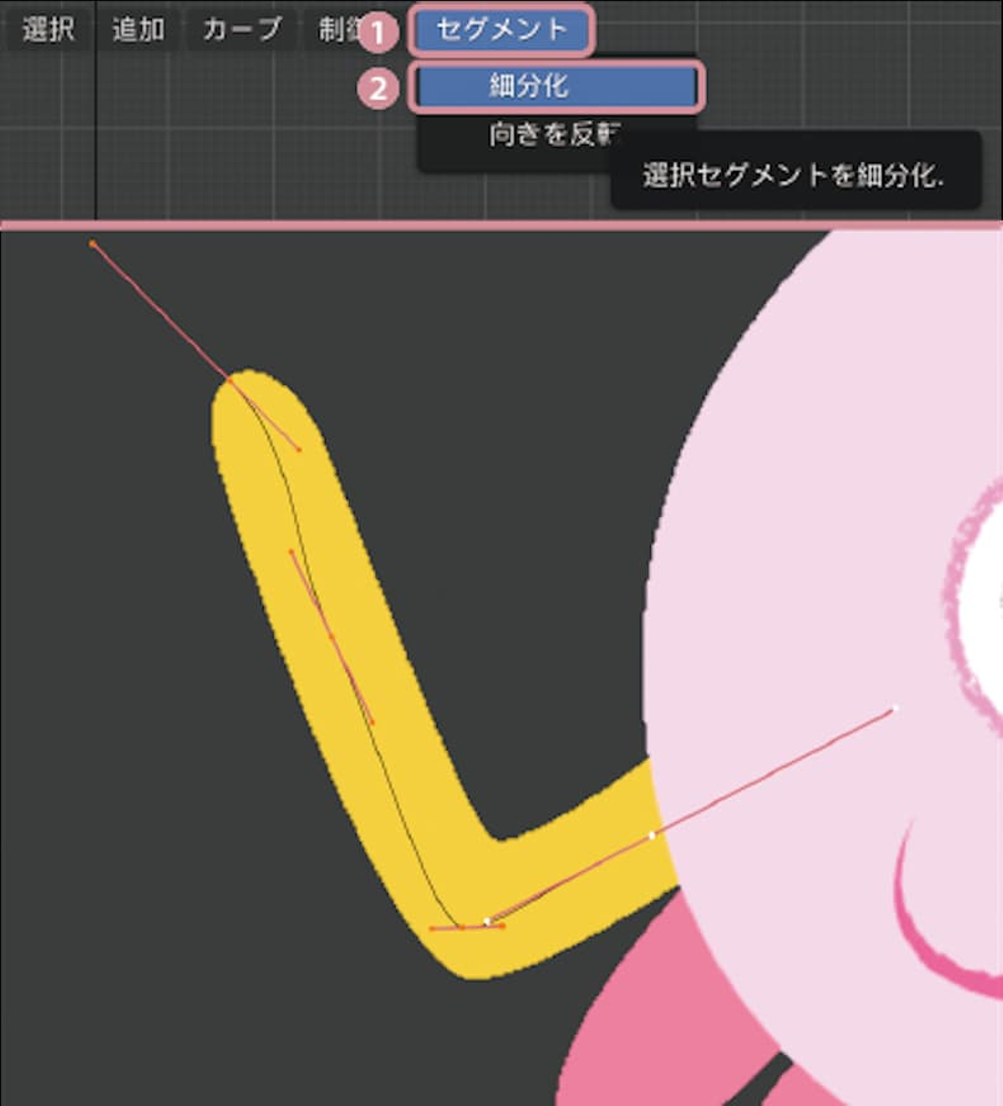 編集モード [Tabキー] → セグメント → 細分化 で頂点を増やして編集しやすくします