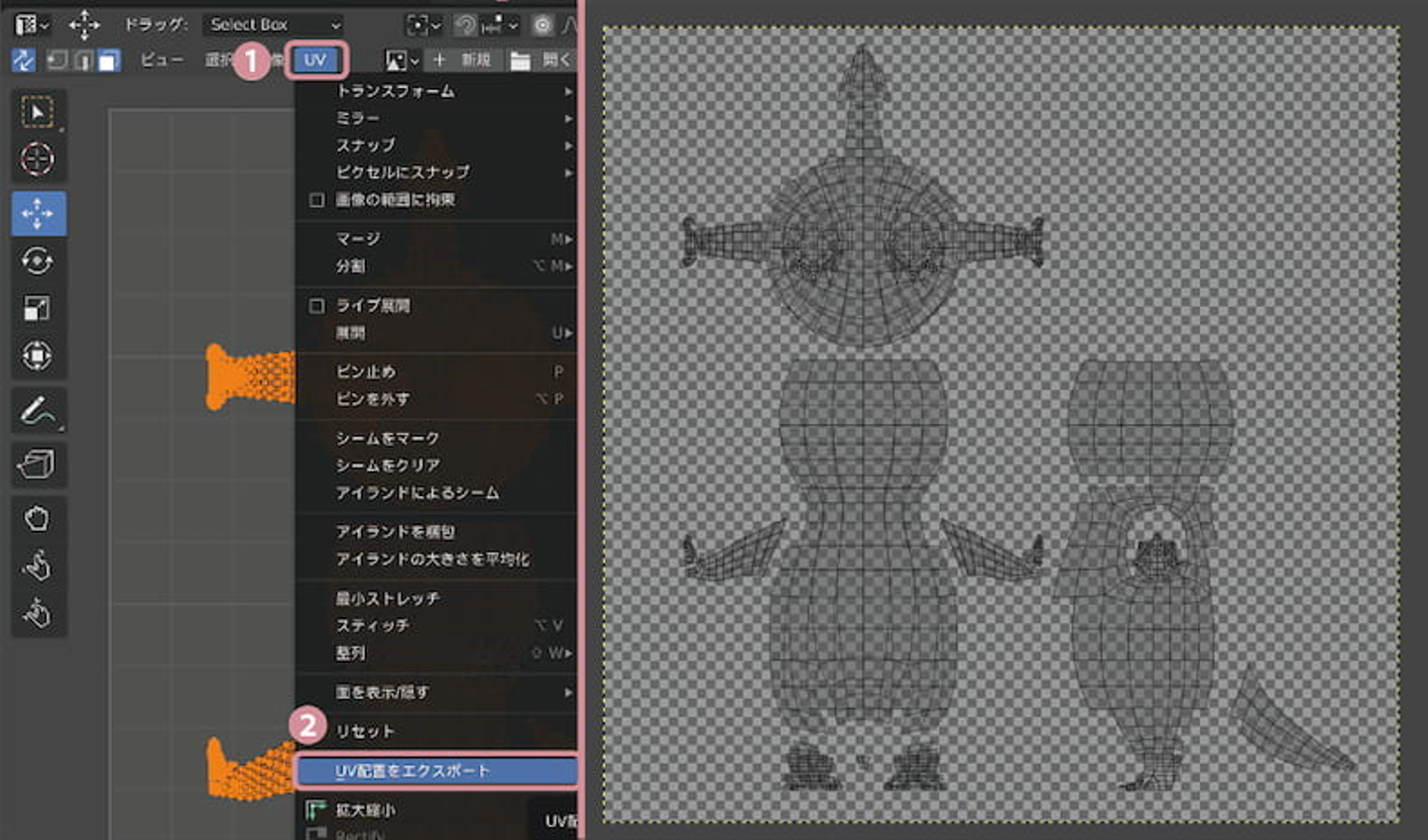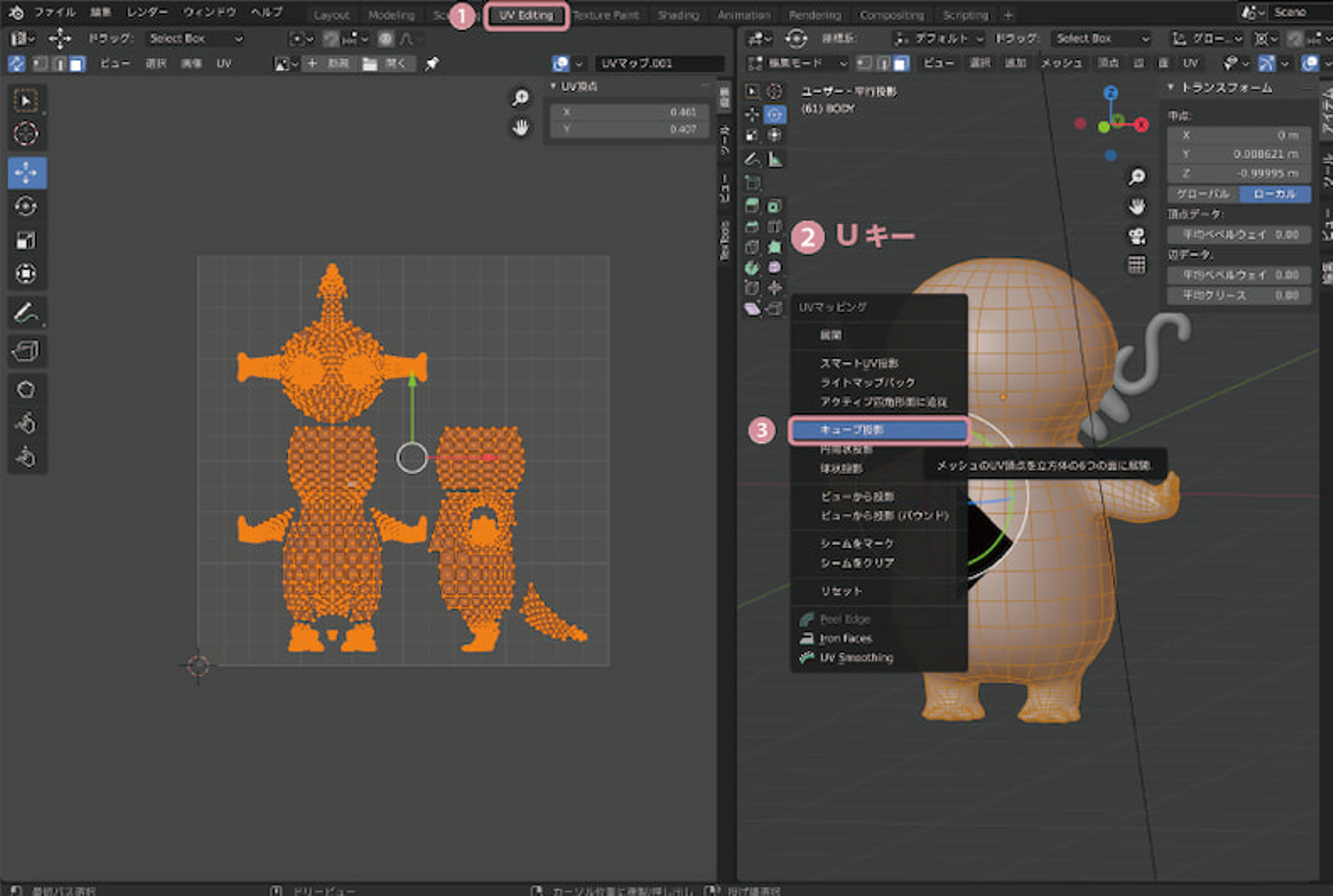 左画面がUV編集、右画面がオブジェクト編集になりどこを展開しているのか分かりやすくなります。