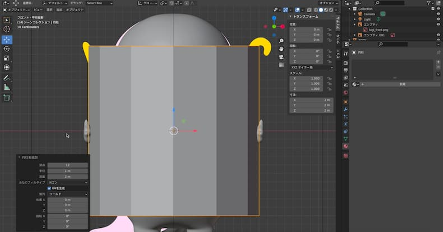 ① オブジェクトモード [tabキー] → 追加 → メッシュ → 円柱を追加