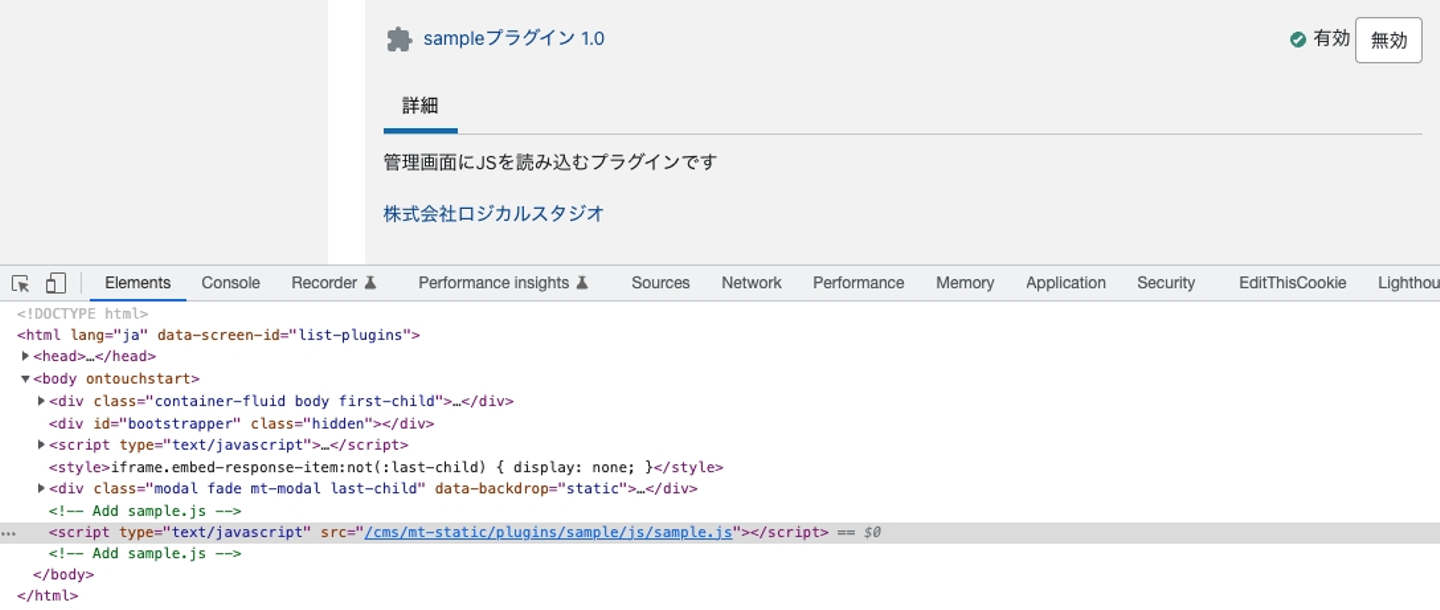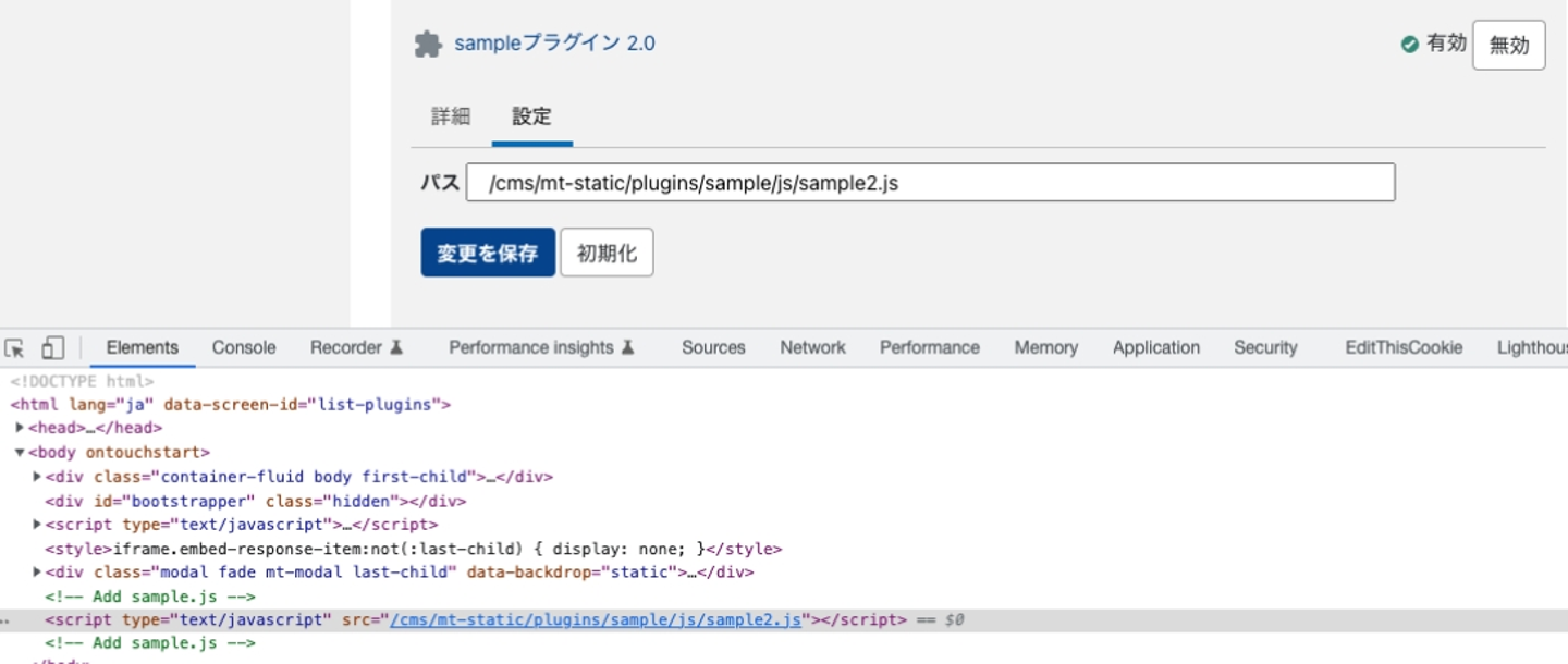 <script type="text/javascript" src="/cms/mt-static/plugins/sample/js/sample.js"></script>