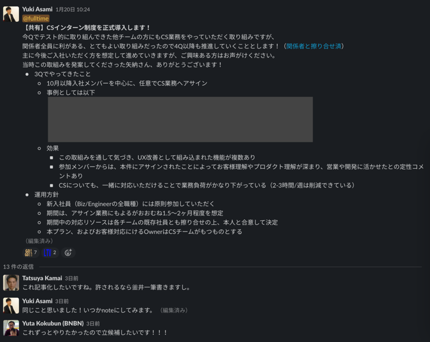 最後は完全にCSチームにとってのプラスなのですが、、実務を一緒にやってくださることで自身がもつタスクが削減され、本当にめちゃくちゃ助かっています。