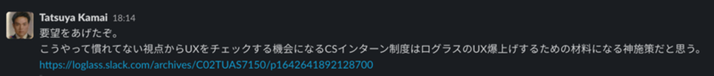 「前職ではto BプロダクトのPdMでありながらも、黎明期はセールスもCSもPdMもすべて自分でやる必要があり、おかげでCSが感じること・お客様が感じることを深く理解しながらプロダクトづくりを進めることができました。ログラスでも早々にその状態に到達したいという思いから、浅見に「お客さんのオンボーディングを手伝わせてほしい」とお願いして携わらせてもらいました。誰しも、プロダクトを提供する側にいると徐々にその機能に落ち着いた背景や実装上の制約などの知識が溜まってしまい、現状を疑う力が徐々に失われてしまいます。また他方で、新たに参画したメンバーがプロダクトに習熟する上での課題(プロダクトの仕様を把握するコスト/難易度が高い、仕様の背景にあるユースケースや課題意識がわからない、等)も簡単には解決できるものではありません。特にto BのSaaSは業務に使われるものであり、ユーザ視点でプロダクトと向き合うことが難しい。その業務ドメインの実務経験者でなければ尚更です。そうした中でCSインターン施策は、参加者が・ユーザの業務に触れてドメイン知識が深まる、ユーザ視点を獲得できる・お客様のフィードバックを直接受け止めることができる・お客様の気づきを(良いことも悪いことも)感じ取ることができる上に、開発サイドとしても・メンバーが新規参画する度にフレッシュかつ批判的な視点で改善の種を得られる・繰り返し声が上がることで、UX改善の優先度を上げやすくなる・CSがマンパワーをかけて解決してくれている部分の負荷を体験でき、プロダクトを適切にスケーラブルなものへ進化させられるといったご利益もある最高の施策であると感じました。」