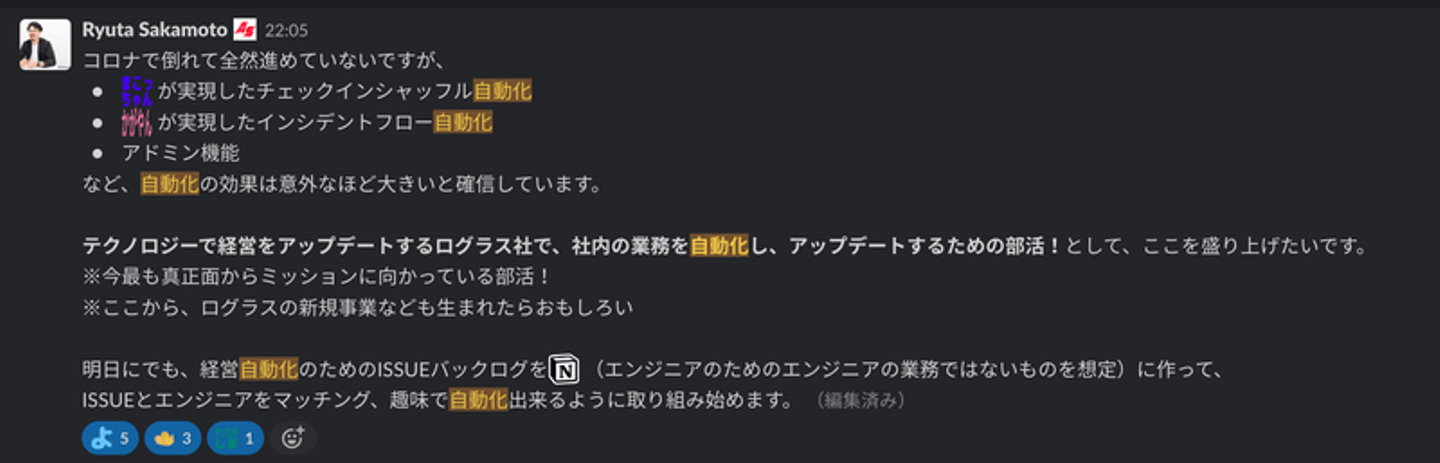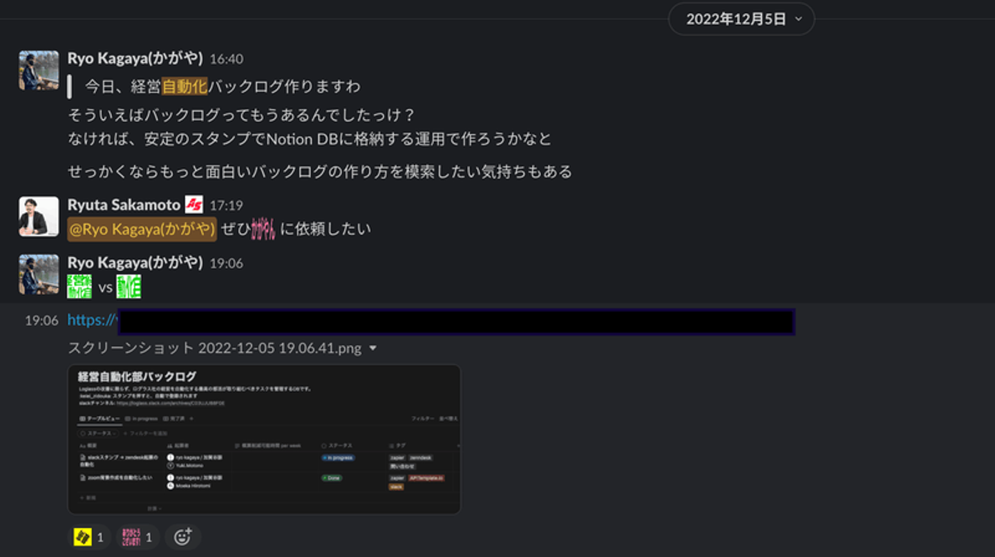 具体的な事例 今回は概要だけです。詳細は別で書きます、書きたい。 他にもZoom背景作るチャンネルだったり、経営自動化部の毎週の成果を通知するBotだったりと色々作った気がしますが、パッと出てきた3つを取り上げます。
