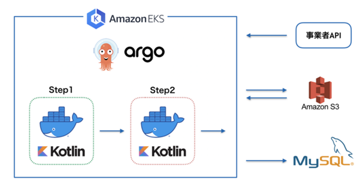 項目内容Tipsバッチ処理Kotlin設計にクリーンアーキテクチャを採用することで既存システムの負債に対抗 & 静的型付け言語による開発の効率化ワークフローArgoKubernetesとの相性がよく採用。ジョブ依存関係が表現され、タスク成否が可視化されるストレージAWS S3開発用にはMinioを使用インフラKubernetes複数コンテナをよろしく管理してくれ、複数サーバでのバッチ管理を実現してくれる & 当社インフラが全体的にKubernetesに移行中であり整合性を取れる