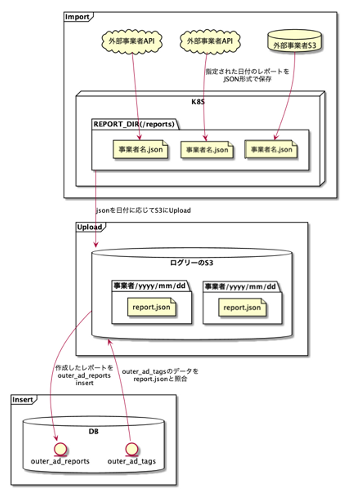 - AWS S3へuploadしたデータをDBへinsertする。各タグ情報やレポートの最終取込時刻を管理するouter_ad_tagsテーブルを参照しつつ、outer_ad_reportsテーブルにレポートデータを登録する。取り込んだデータは管理画面での数値確認や請求確認用データとして活用