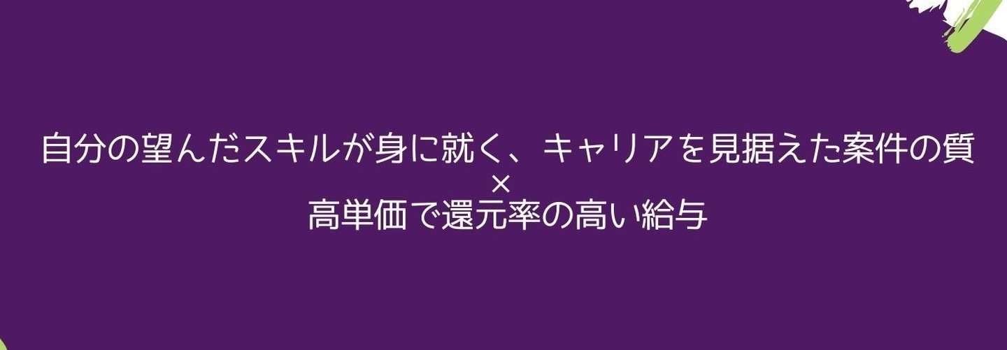 ①自分の望んだスキルが身に就く、キャリアを見据えた案件の質 「エンジニアになりたくて入社したのに家電量販店で販売員をやらされた」 「運用や保守の案件ばかりでスキルアップできない、自社に掛け合っても同じような案件しかない」 SNSなどでたまに耳にする話ですが、エンジニアとしての経験が積めない・同じような案件ばかりでスキルアップができない方は割と多いと思います。
