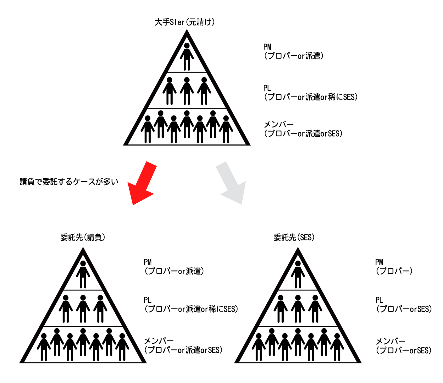 そのため大手企業になるほど監査や外部の指摘が非常に厳しく、数年前からSESでの単独常駐を禁止する、SESで来ている人にPMやPLを担当させないといった動きもごく当たり前にあります。