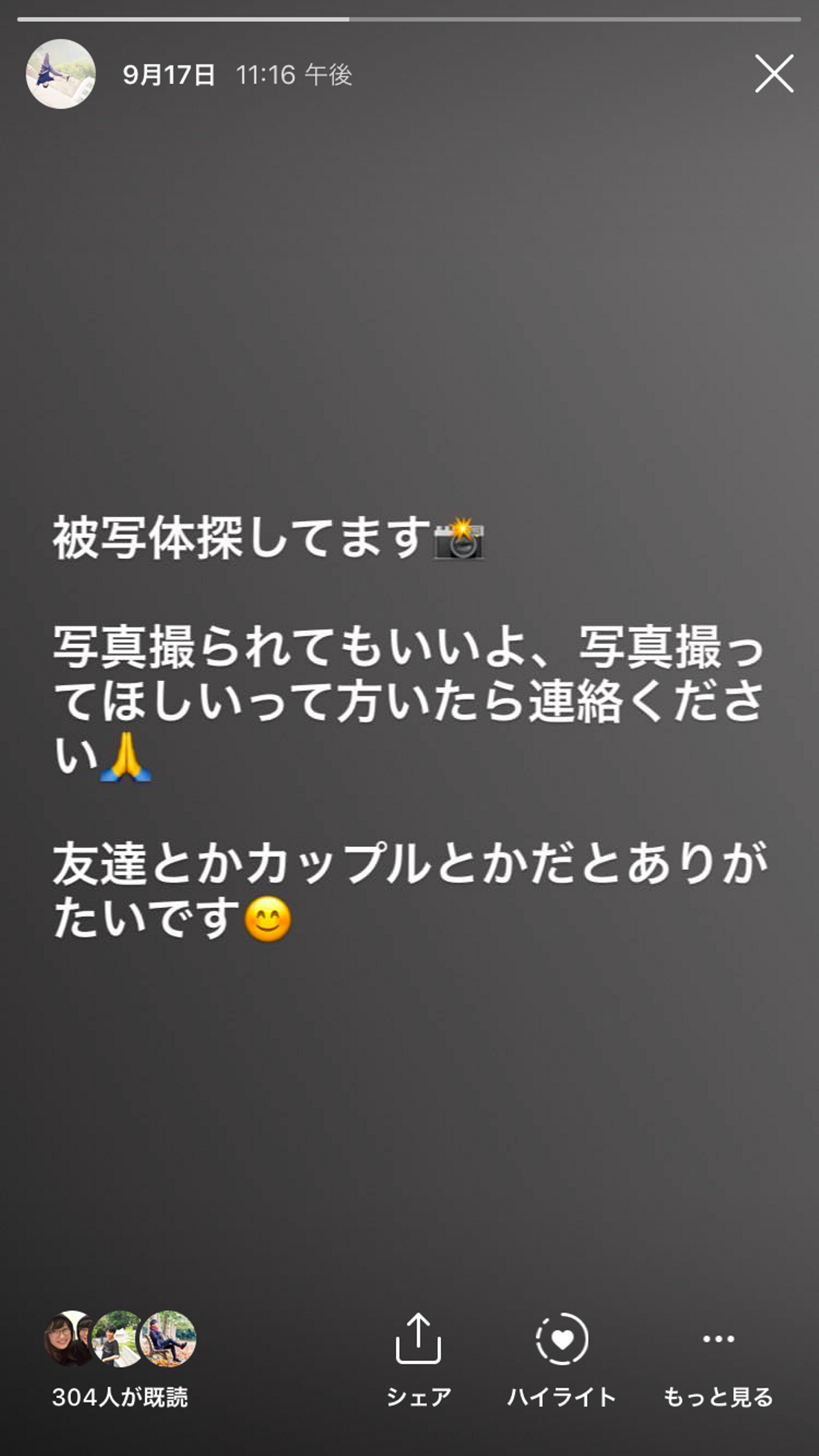 講座を受講する中で大変なのが、被写体探しです。毎回新しい写真を撮らなければいけないので、多くの人にお願いする必要があります。僕は、Instagramで「写真撮ってほしい人連絡ください!」って募集して、連絡をくれた友達・カップルを撮影していました。合計で7組ほど撮影させてもらいました。