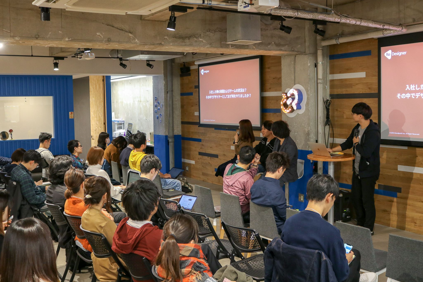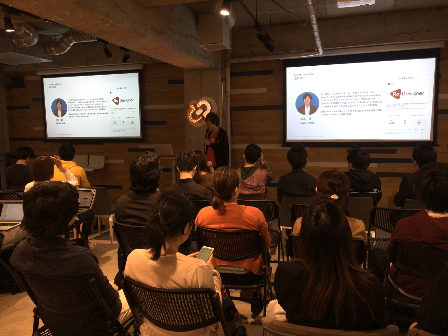 会場は Goodpatch さんのオフィス!エントランスのネオンサインがカッコいい...! イベント冒頭ではGoodpatchの佐宗さんから「ReDesignerを立ち上げた背景と想い」をテーマにLTがスタート! Goodpatch・佐宗さん Goodpatchの佐宗と申します。現在は「ReDesigner」の事業責任者とキャリアデザイナーを兼務しています。私はもともとUXデザイナーとしてGoodpatchに入社しており、ワークショップ設計やアライアンスなどを担当する中で、合計200を超える国内外のデザイン組織を見てきました。そこで感じたのが、デザイナーという役割や認識のギャップです。 現在はデザイナーの需要が高まっており、2018年5月には経済産業省・特許庁から「デザイン経営」宣言が発表されました。企業が独自価値とブランドを向上させるためには「サービス開発の最上流からデザインが関わる」「経営チームにデザインの責任者を設置する」などの取り組みが必要と明記されています。 一方で、デザイナーと企業の間でミスマッチが起きていることも事実です。「企画とデザインが分断されていて上流から関わることができない」「入社してみたら思っていた仕事と違った」という実態がまだまだあります。この環境を変えるのが、ReDesignerです。 ReDesignerは「デザイナーがパフォーマンスを最大限発揮できる社会を作る」をビジョンに掲げ、デザイナーと企業の間に入ることで最適なマッチングを実現させ、HR×デザイン業界の変革に挑みます。サービスができるまでのデザインプロセスは「 note 」にまとめたので、ご覧いただけると幸いです。 FABRIC TOKYOからはCTOの中筋・開発デザイナーの菅が登壇! CTO・中筋より <自己紹介>