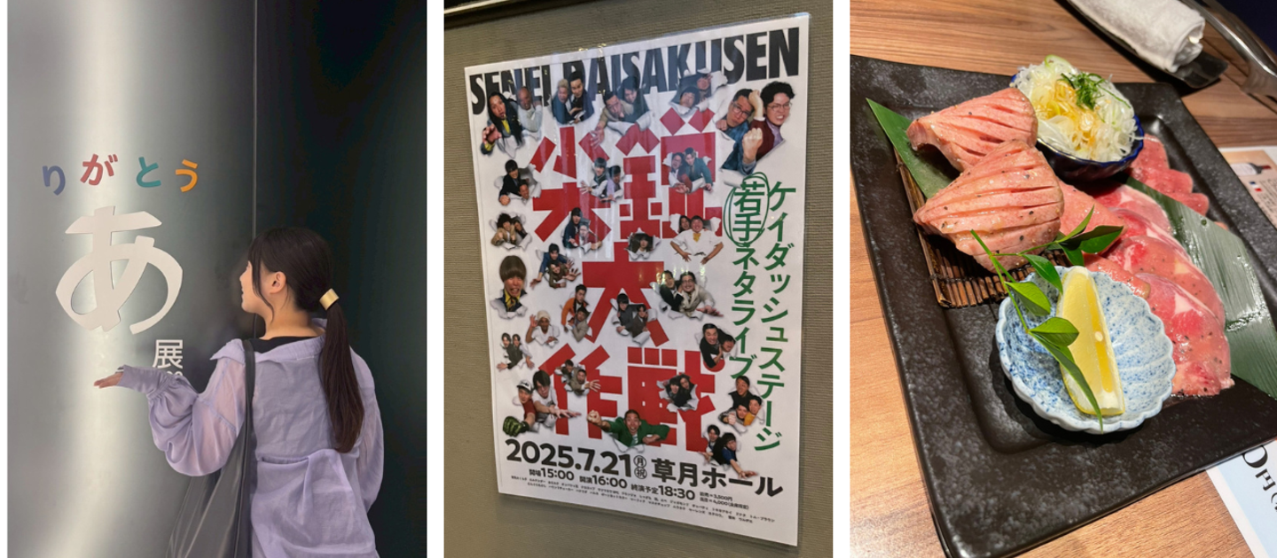 週末や仕事終わりには、友人とピクニックに行ったり、平成レトロな雰囲気の居酒屋をめぐったりしています。最近は、ケイダッシュステージ所属の若手芸人が出演するライブや「デザインあ展neo」にも足を運びました。体験型の展示が多く、とても楽しかったです!基本的にお休みの日はご飯を食べることが多いです!