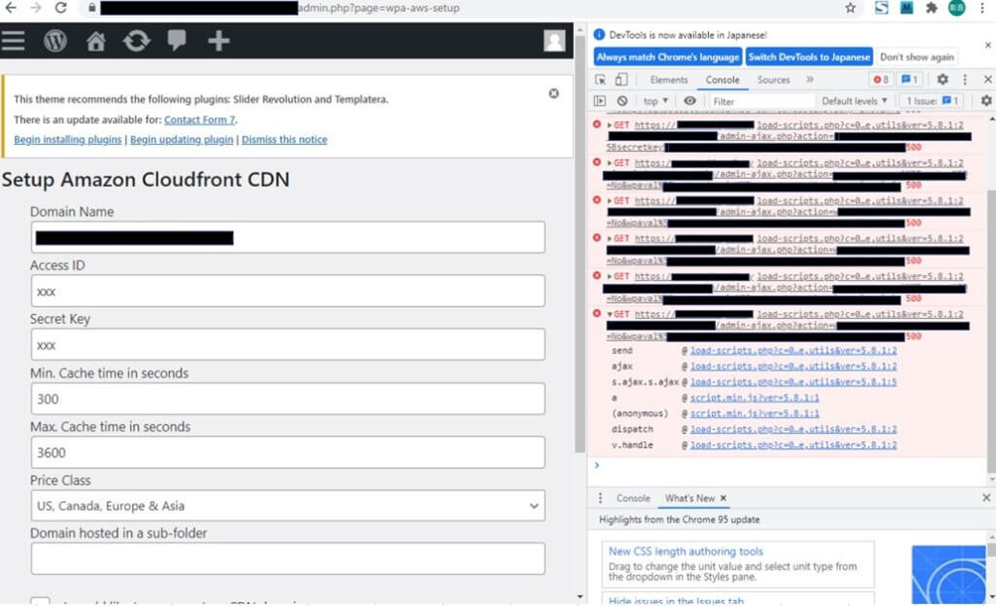 プラグインをインストールし手順にそってCreate Distributionを押下しましたが、いくらボタンをおしてもCDNのディストリビューション作成ができない、という事象が発生しました。調査のためconsoleを確認すると、謎のajaxエラーが発生しており、jsonによるレスポンスが返ってきていませんでした。