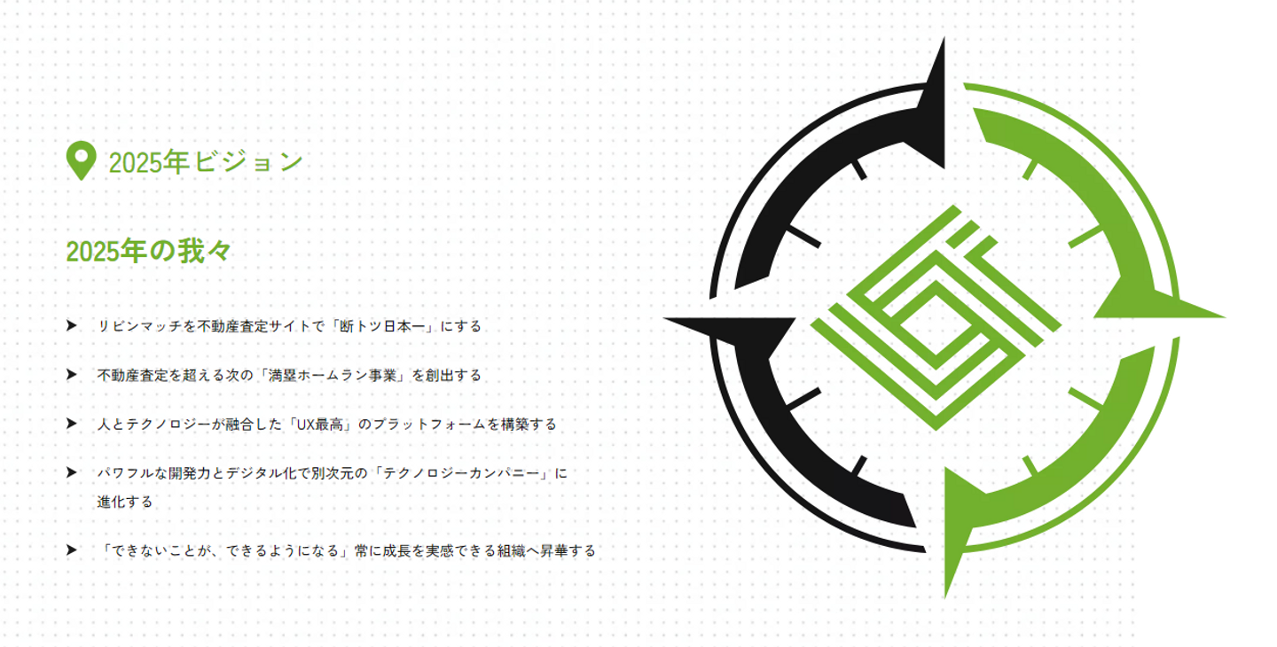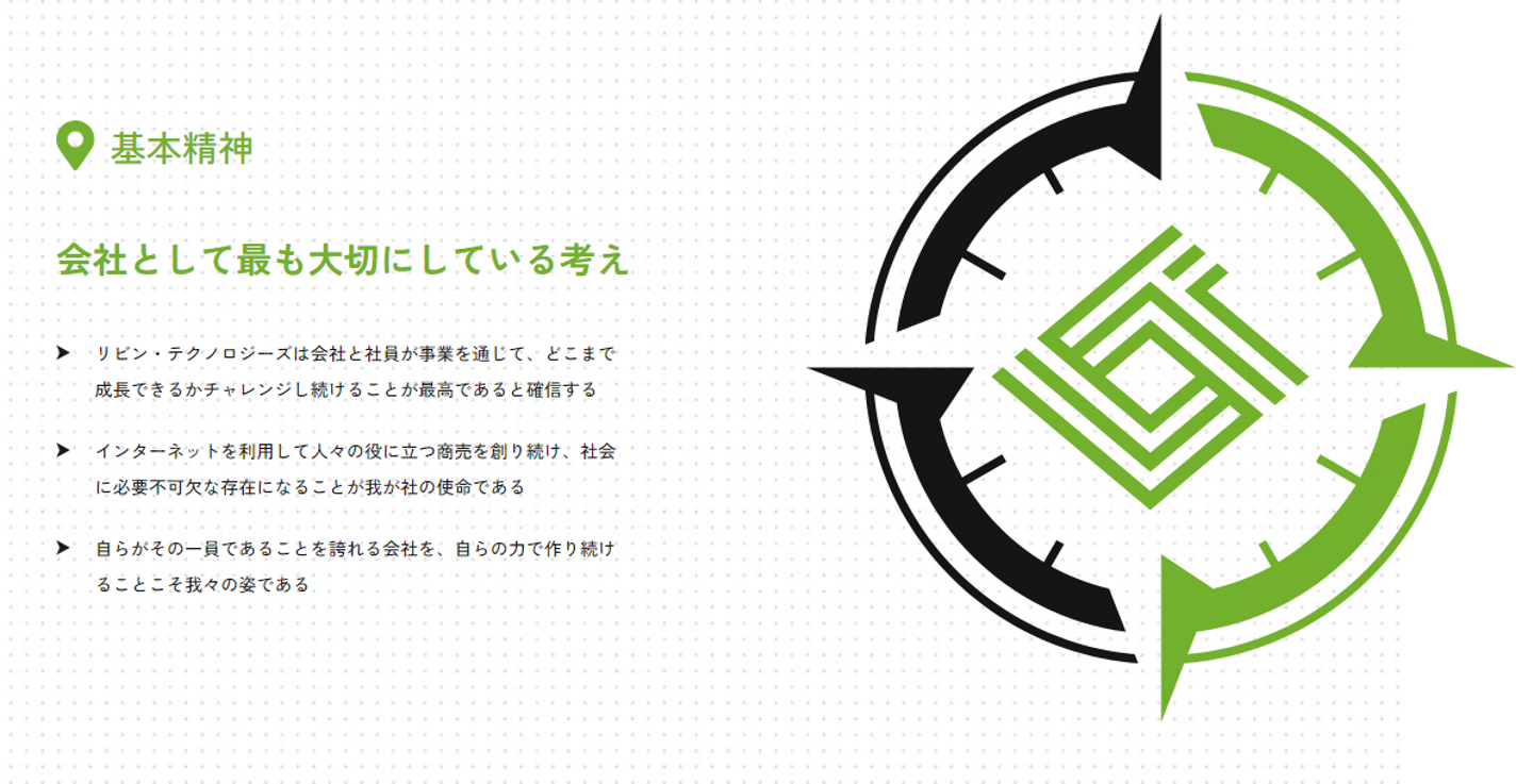 「コンパス」は、「目的地」「基本精神」「行動規則」「2025年ビジョン」の4項目で構成される当社の根本となる考え方や目標の集合体(全体方針)です。全ての項目が目的地へ繋がっています。リビン・テクノロジーズ株式会社の方位磁針でありナビゲーションがコンパスです!