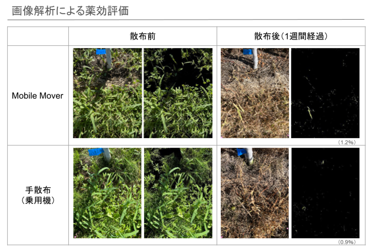 散布後の圃場の様子を確認すると、株元から一定の幅で均一に散布できていることが分かります。除草剤の使用量を大幅に削減できただけでなく、画像解析による薬効評価でも効果は十分に確認できました。