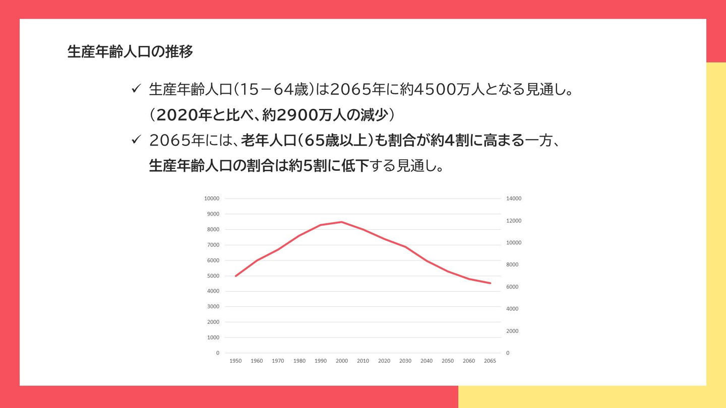 従業員の高齢化に伴い、貴重な人材が継続して働けなくなっていくことも、今の日本においては問題となっています。また少子化により生産年齢人口が減少していることから、今後も長期的に深刻な人材不足が続くといわれています。