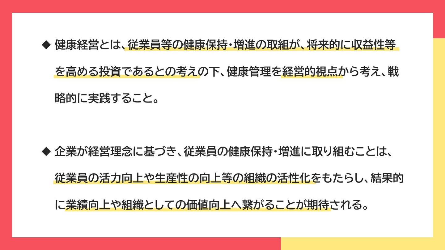 つまり、これまで従業員個人が実施をしていた健康管理を、企業が「会社を成長させる投資」として捉え、主体となって取り組んでいくことを意味しています。