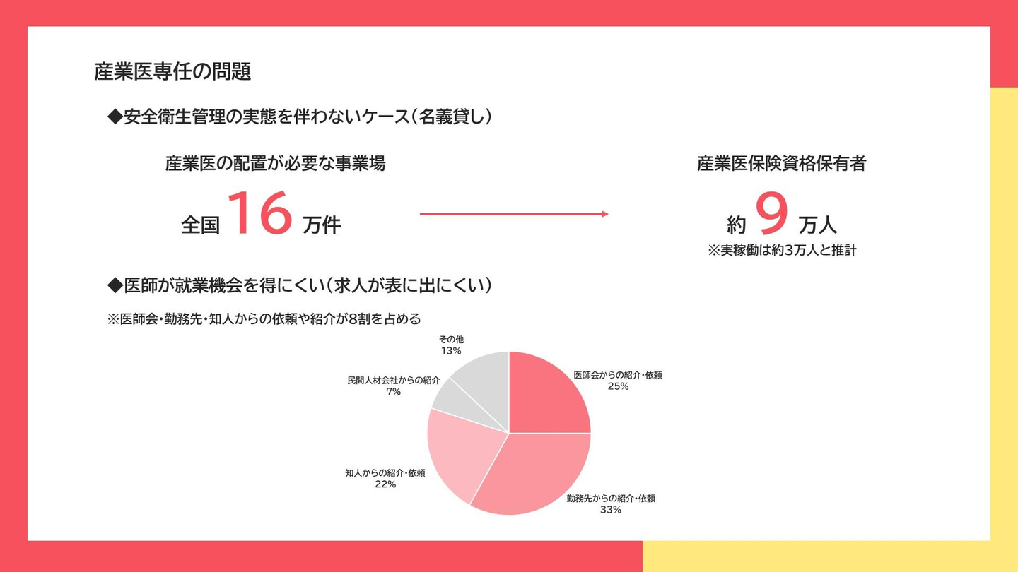 「産業医になりたい」と思っている医師がいながらも、実際にはそのチャンスを得づらいことも問題の要因になっています。