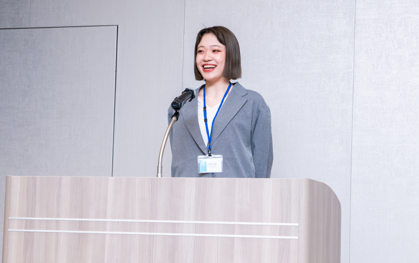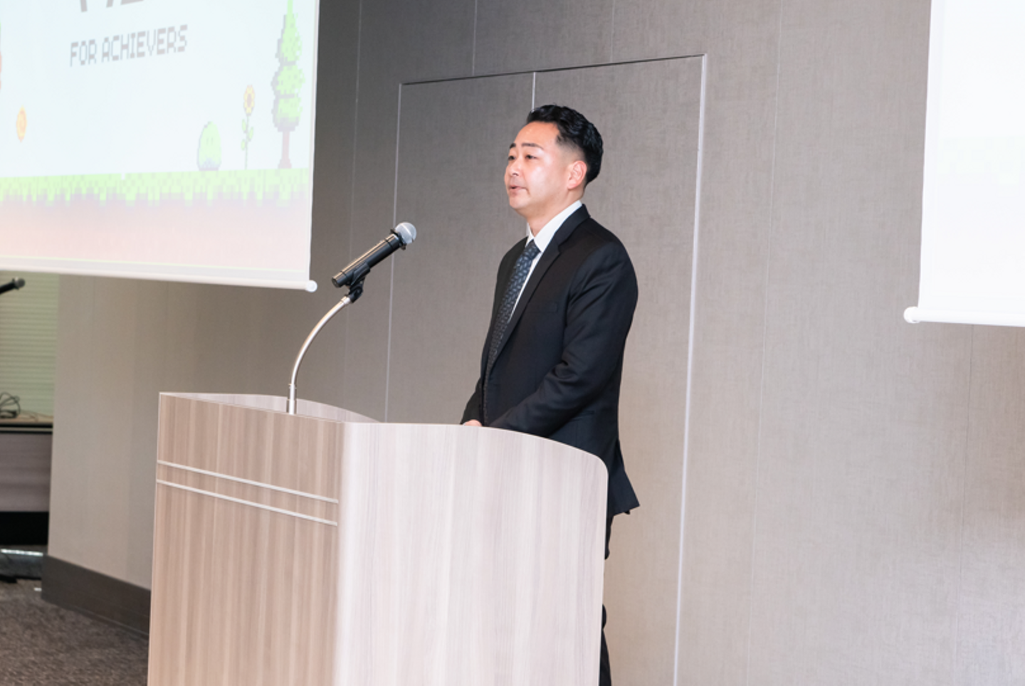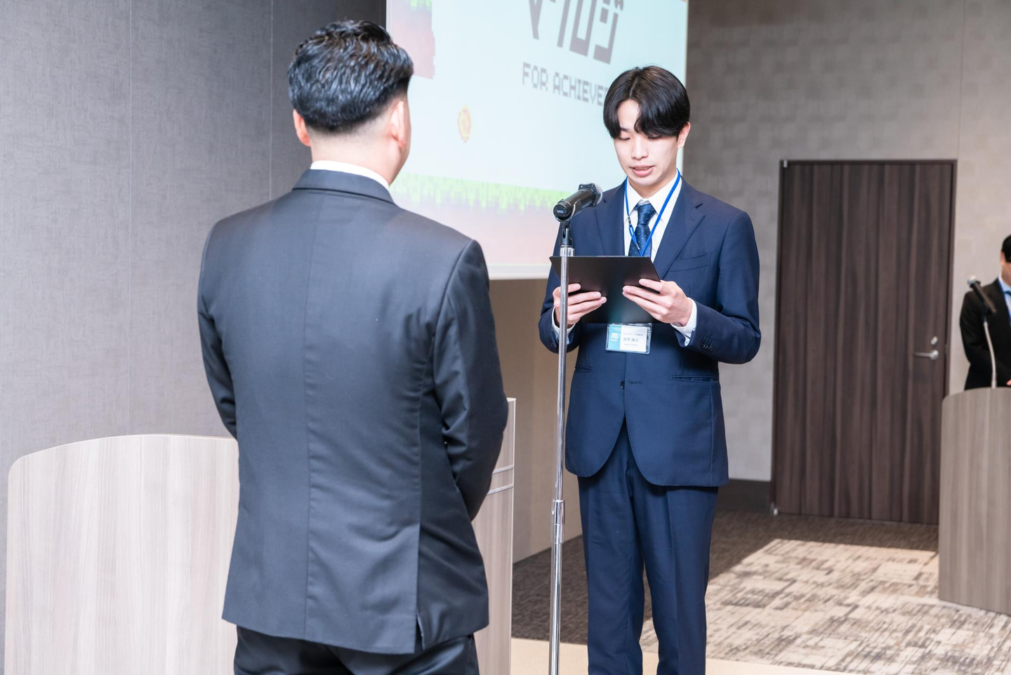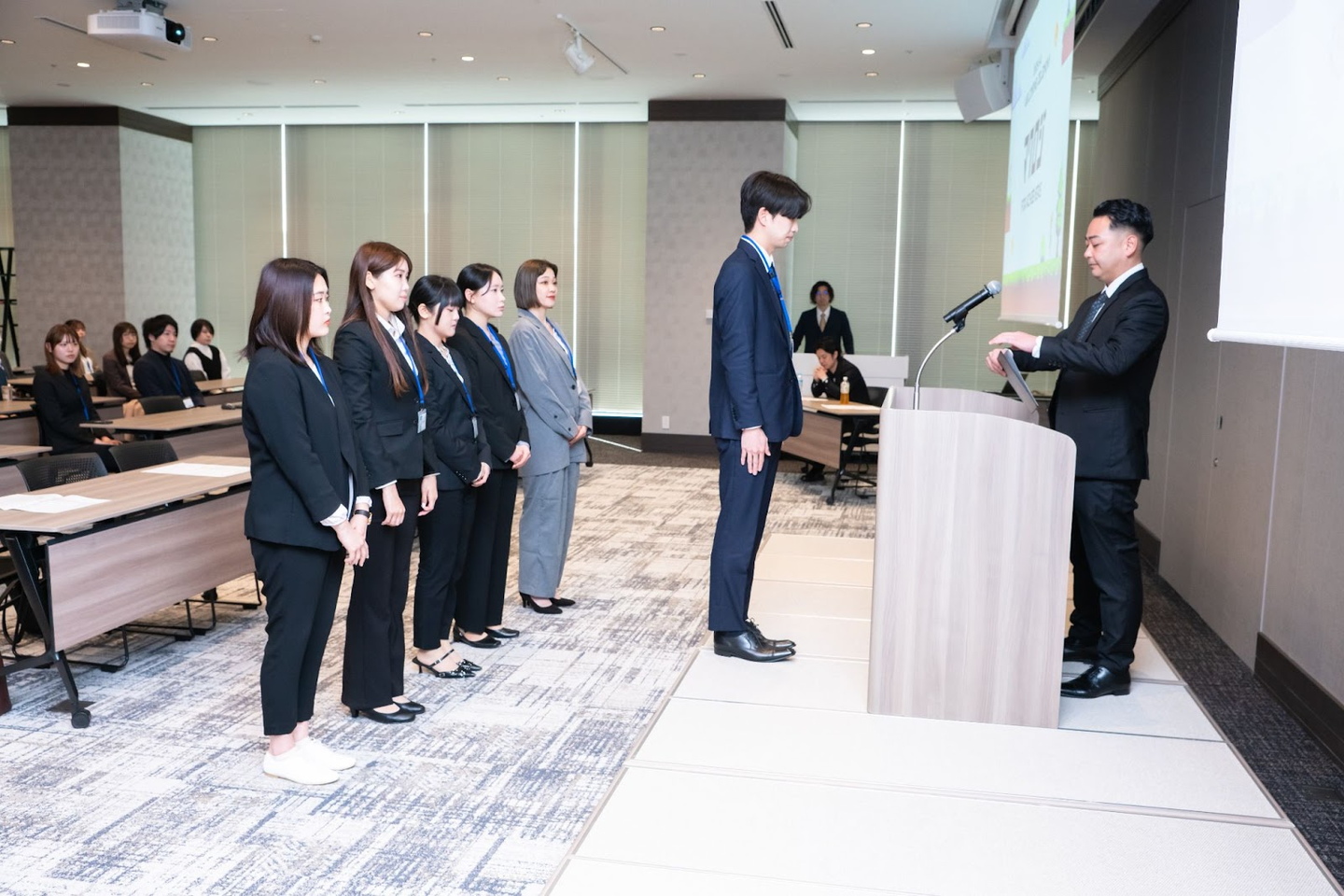 新入社員代表挨拶ではFさんが、素晴らしいスピーチを発表してくれました。ステージに上がった凛々しい姿で、会場の空気が一気に引き締まりました。