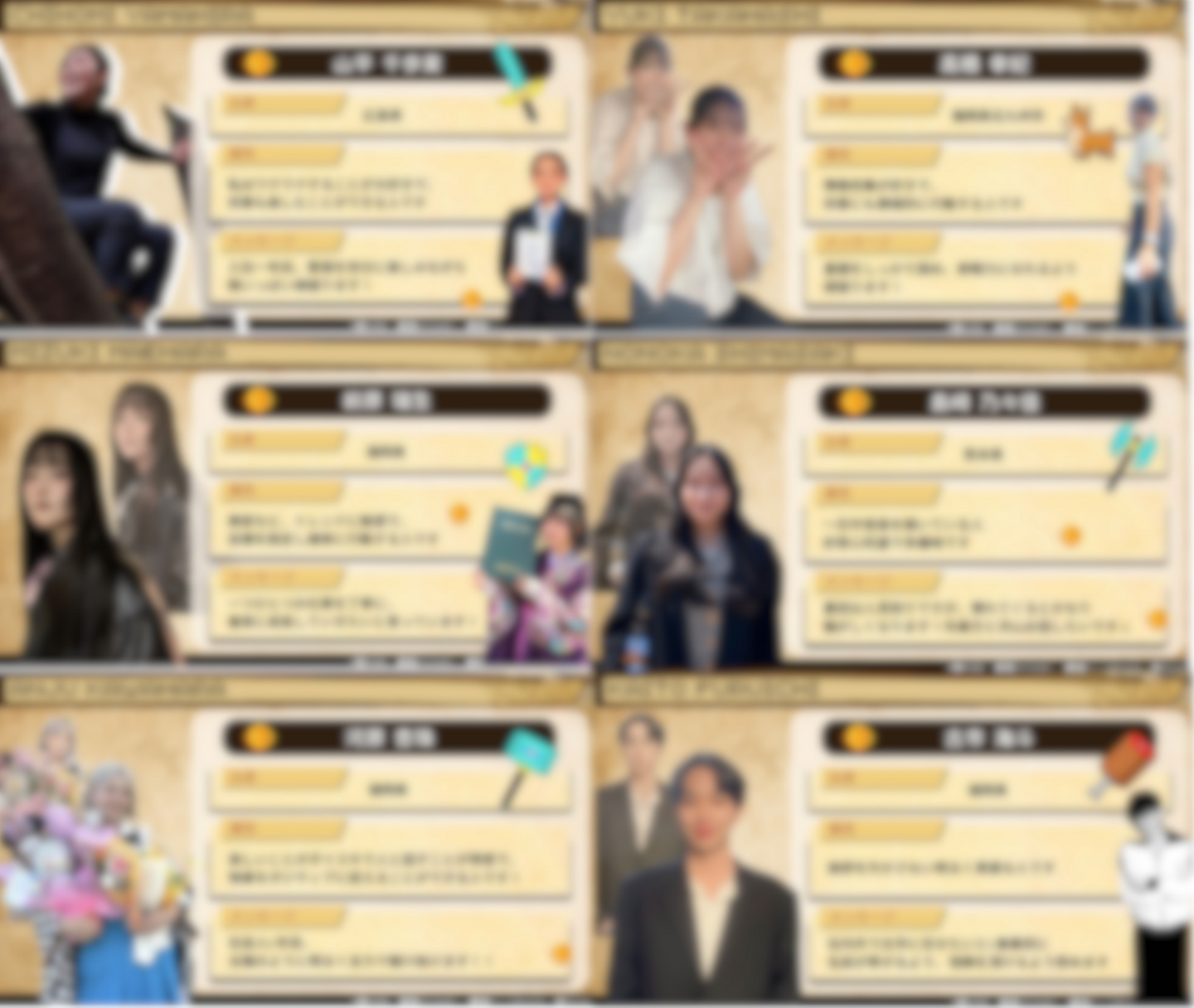 属性とメッセージを一枚にしたスライドとともに、一人ひとり名前が呼ばれ紹介が行われました。写真もAIでゲームのキャラ風に!