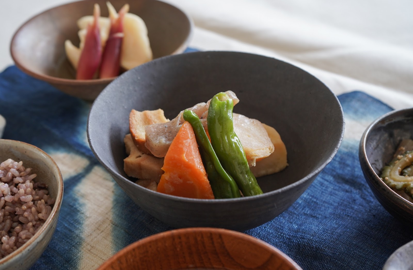ゴーヤのきんぴらは、ゴーヤを塩もみしてさっと茹でることで、苦味を少しとり、程よい苦さをイメージしています。