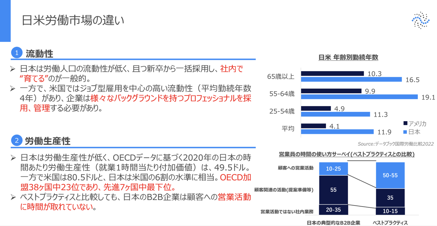 日本と米国では、営業組織を取り巻く環境が異なります。倉林氏によると、中でも労働市場においては大きく2つの違いがあるといいます。