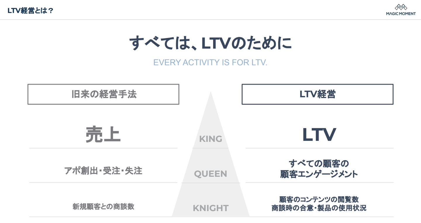 ひとりひとりの行動やふるまいを元に、信頼関係を作っていき、エンゲージメントを高めることが LTV 経営の一丁目一番地だと思っています。商談数を上げたり、アポを取ったりすることも大事なんですが、LTV とは直接関係がないんです。」(村尾)