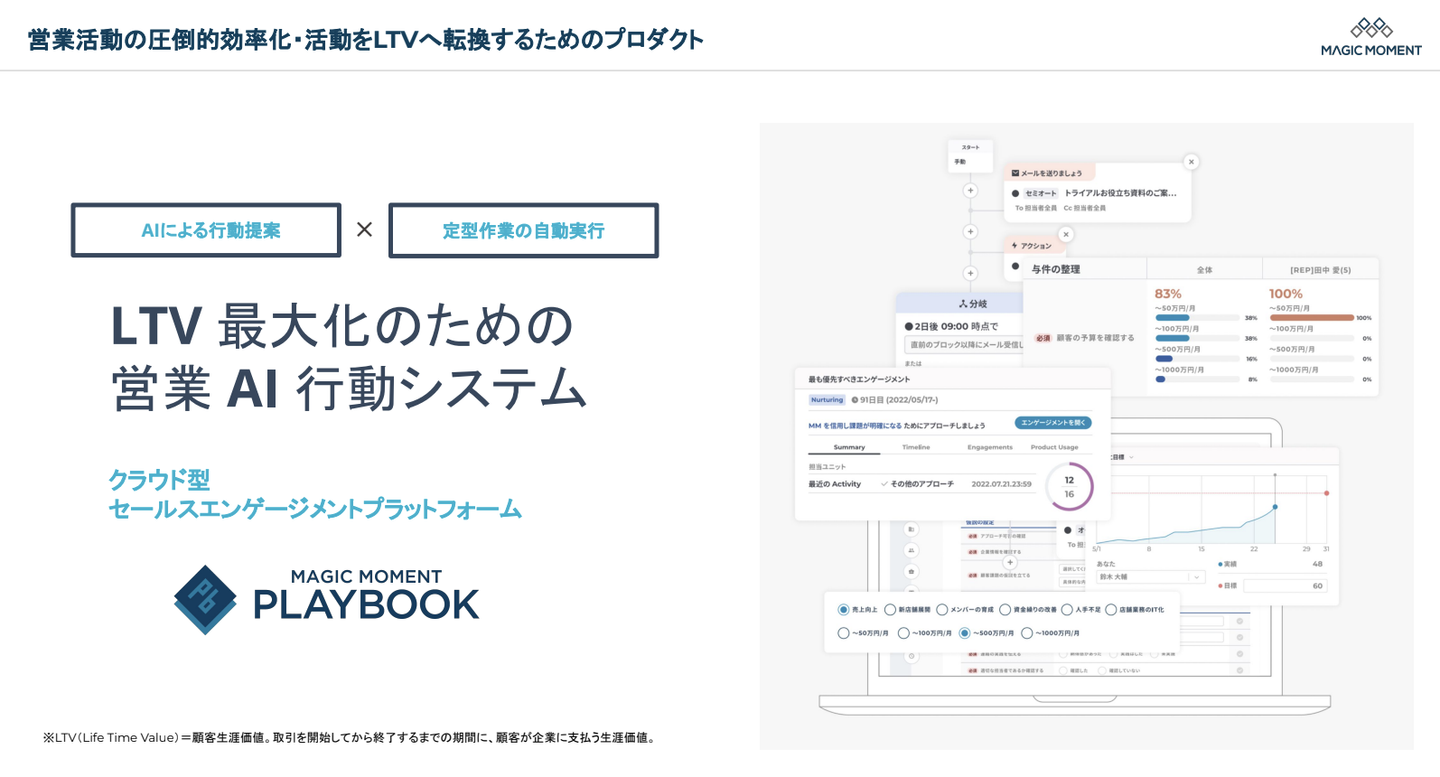 マネージャーがデータを管理するためではなく、営業担当者が目の前の顧客のエンゲージメントを高め、LTV を高めるための活動に集中するための行動支援システムとして Magic Moment Playbook を開発したと村尾は語ります。
