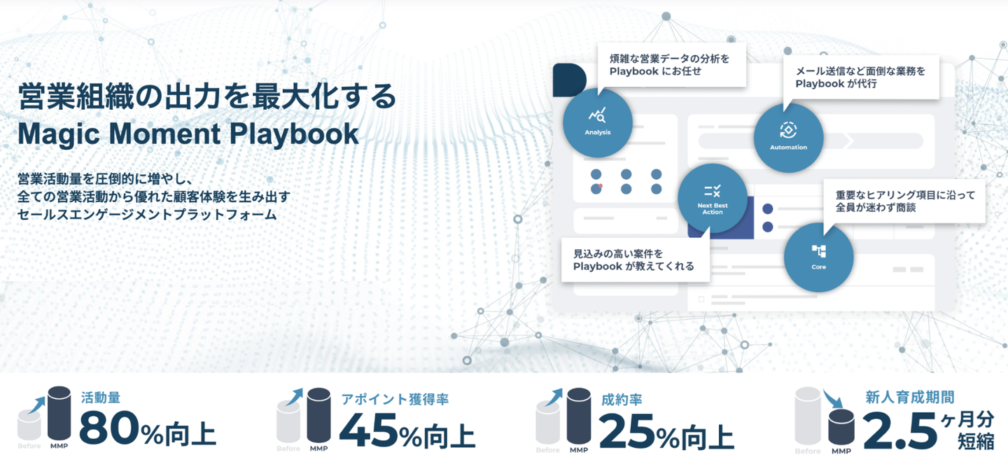 当社では、自社プロダクトである、AI セールスエンゲージメントプラットフォーム「Magic Moment Playbook(以下、MMP)」を日々の営業活動で利用しています。