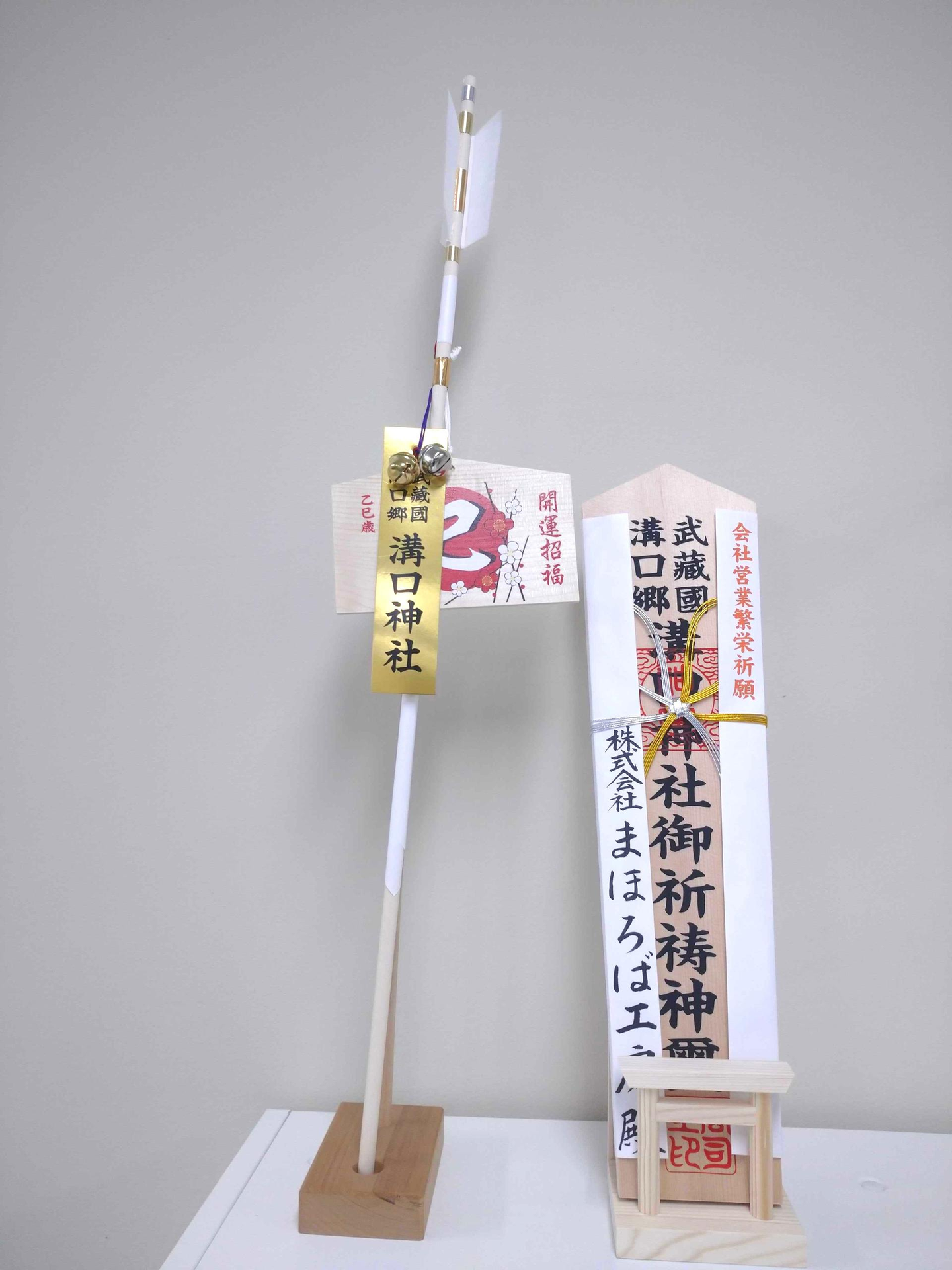 オフィスに戻って、いただいた神札と購入した破魔矢を撮影📸