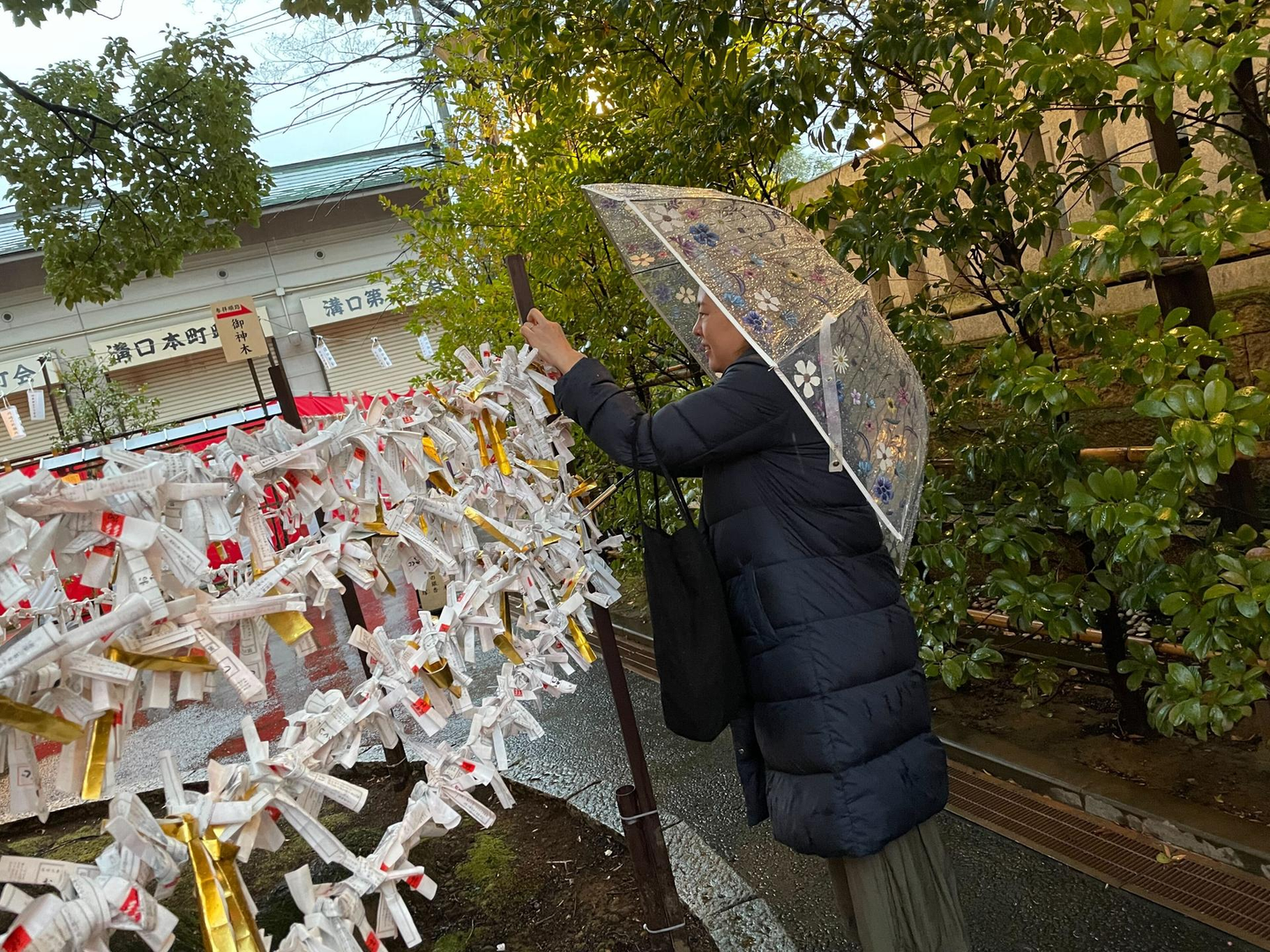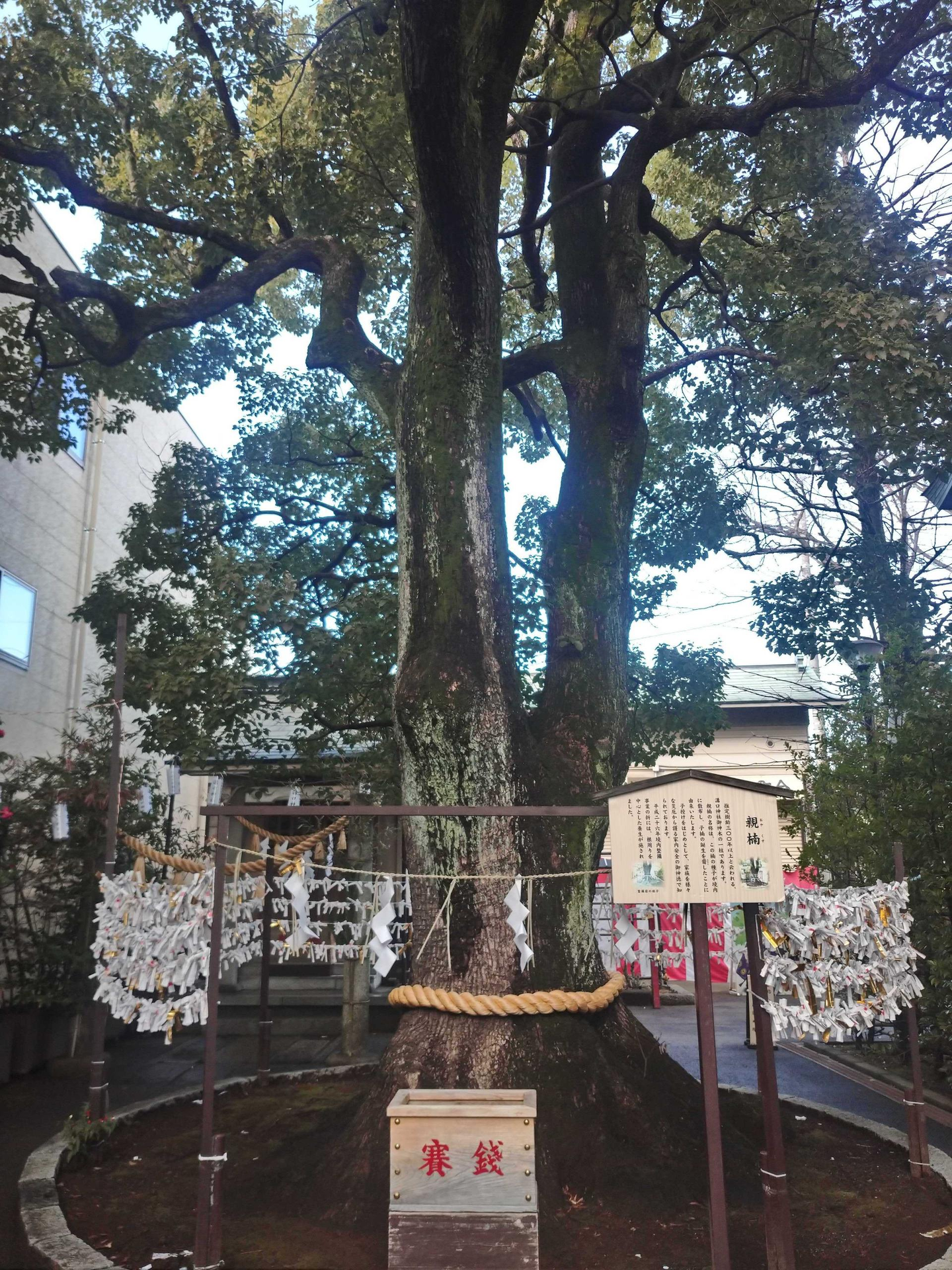 ご神木の1つである楠木を中心におみくじを結んで、プロジェクトの成功を祈ります。