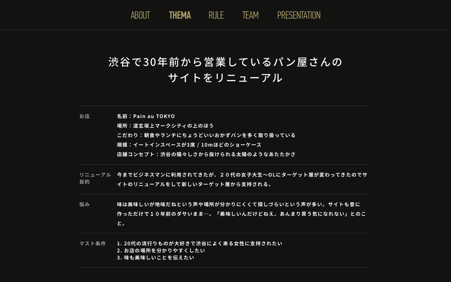 提出概要:リブランディングを中心に、新しいターゲット層の取り入れに注力した内容。店舗名を英語表記から今っぽいカタカナ表記にしたりコンセプトをイチから考えたりと、ストーリー性重視の資料。サイトデザインではスクロール制御で1スクロール1セクションずつスクロールしていくという設計で、左にスクロールナビがついていました。