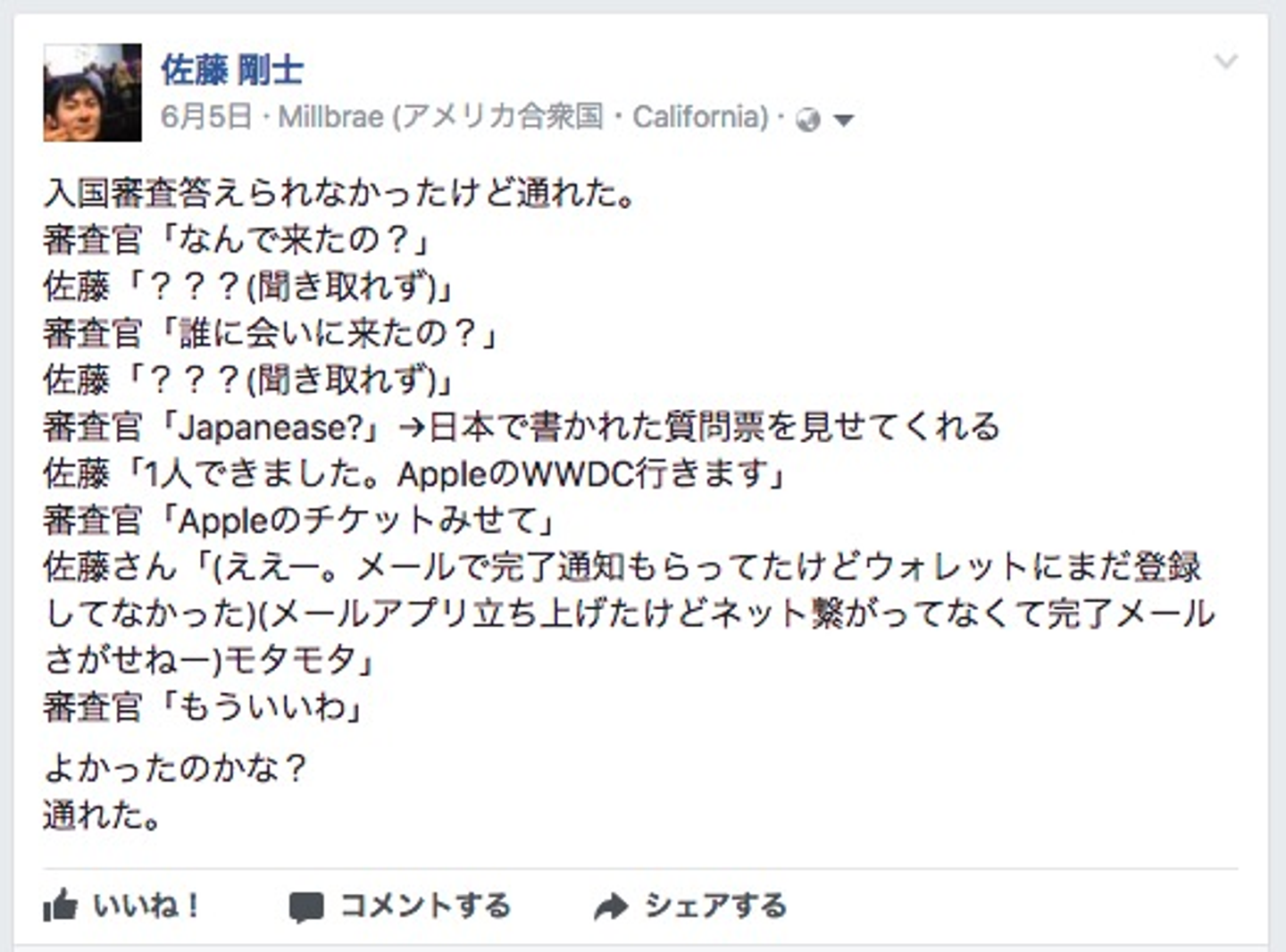 「1人できたので誰にも会いません」と答えると「じゃあなんで来たの?」といぶかしがられてしまい、「WWDCに行きました」「WWDCのチケット見せて」という流れに。。