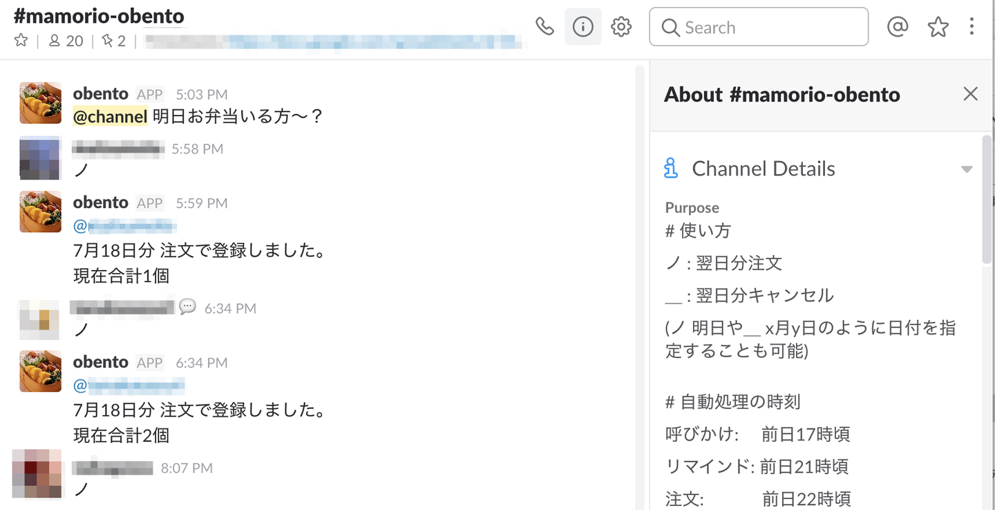 例えば、MAMORIOでは業務改善のためにBotを活用した自動化をおこなっています。その中の一つに弁当botというものが存在します。福利厚生の一環として毎日の弁当屋のランチが無料で頼むことができるのですが、そのために毎日の注文数を朝早く弁当屋にFAXで送る必要がありました。毎日の全員の弁当の発注を漏れなく集計して弁当屋に朝早くFAXで送るのは担当者の負担も大きく大変な業務です。そこでMAMORIOではこの問題をslackのbotを使ってフレキシンプルに解決しました。毎日定時になるとslack内のbotが翌日の弁当の発注を各自に確認し集計をして自動で必要個数を弁当屋にFAXで送るのです。このシンプルな着想により人数が増えても発注ミスなく確実に弁当の発注が可能になり業務負担もなくなりました。(詳しく知りたい人はこちらの記事をどうぞ)