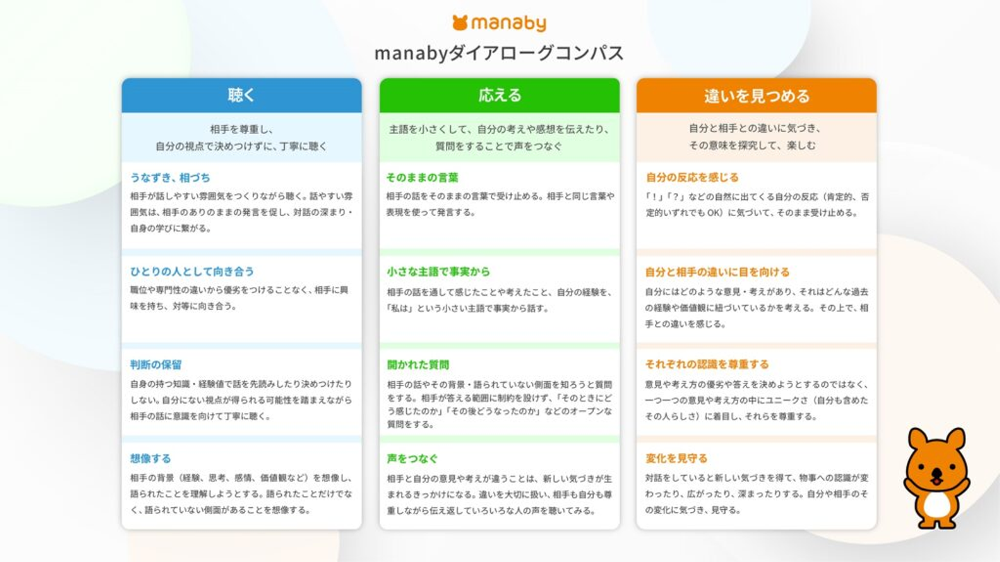 これまでmanabyが学んできたダイアローグの大事なポイントを言語化したものが「ダイアローグコンパス」です。