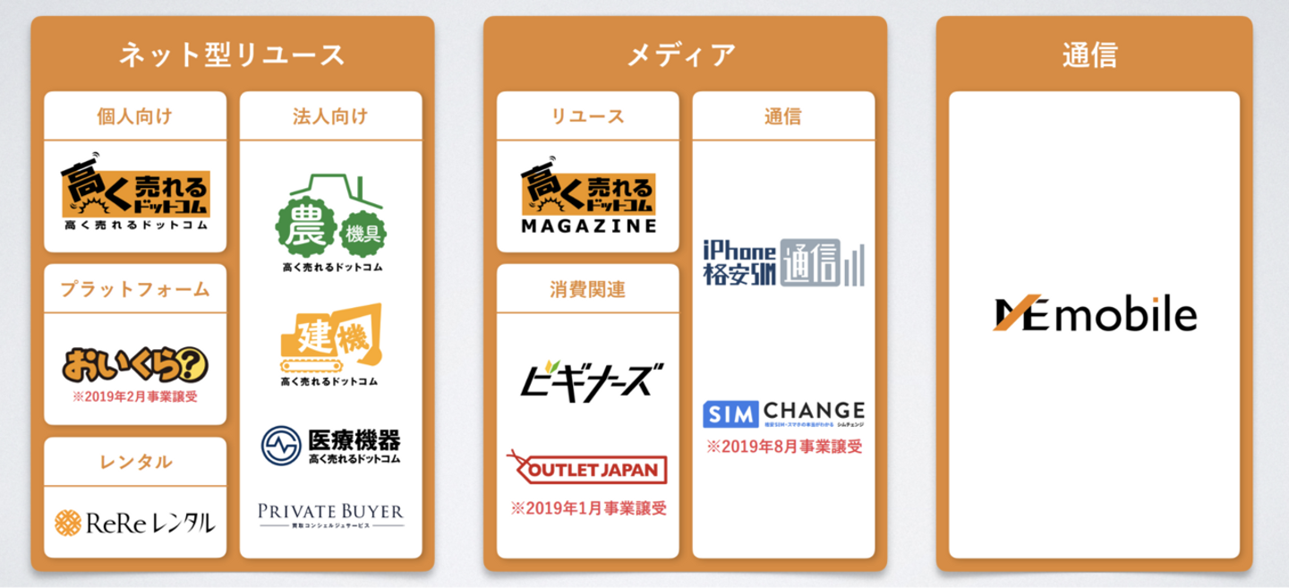 そのため、弊社はリユースを主軸に成長してきましたが、現在は農機具や建設機械、医療機器といった事業者向け、海外向けの商材を積極展開していたり、またメディア事業やリユース業界としては初のMVNOなどを展開しています。