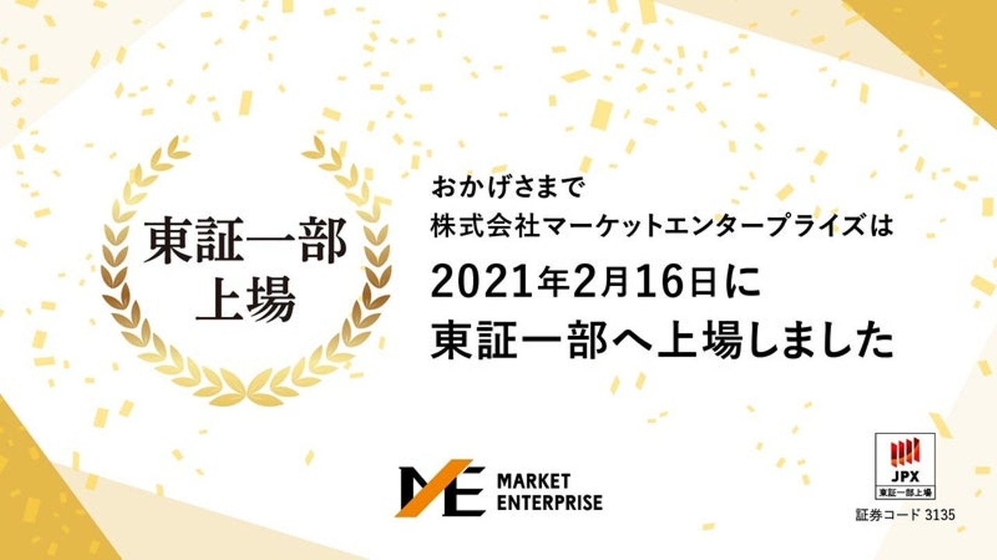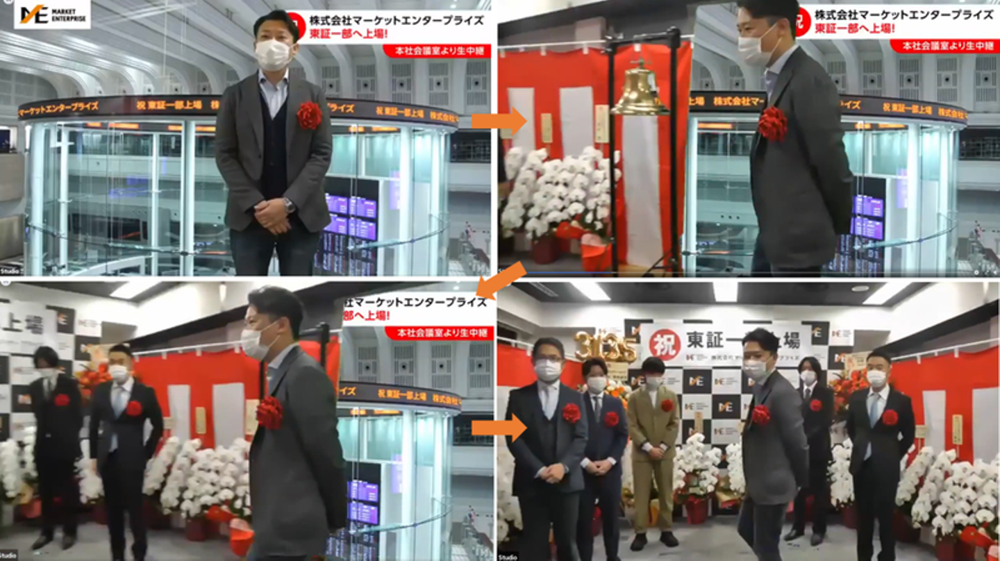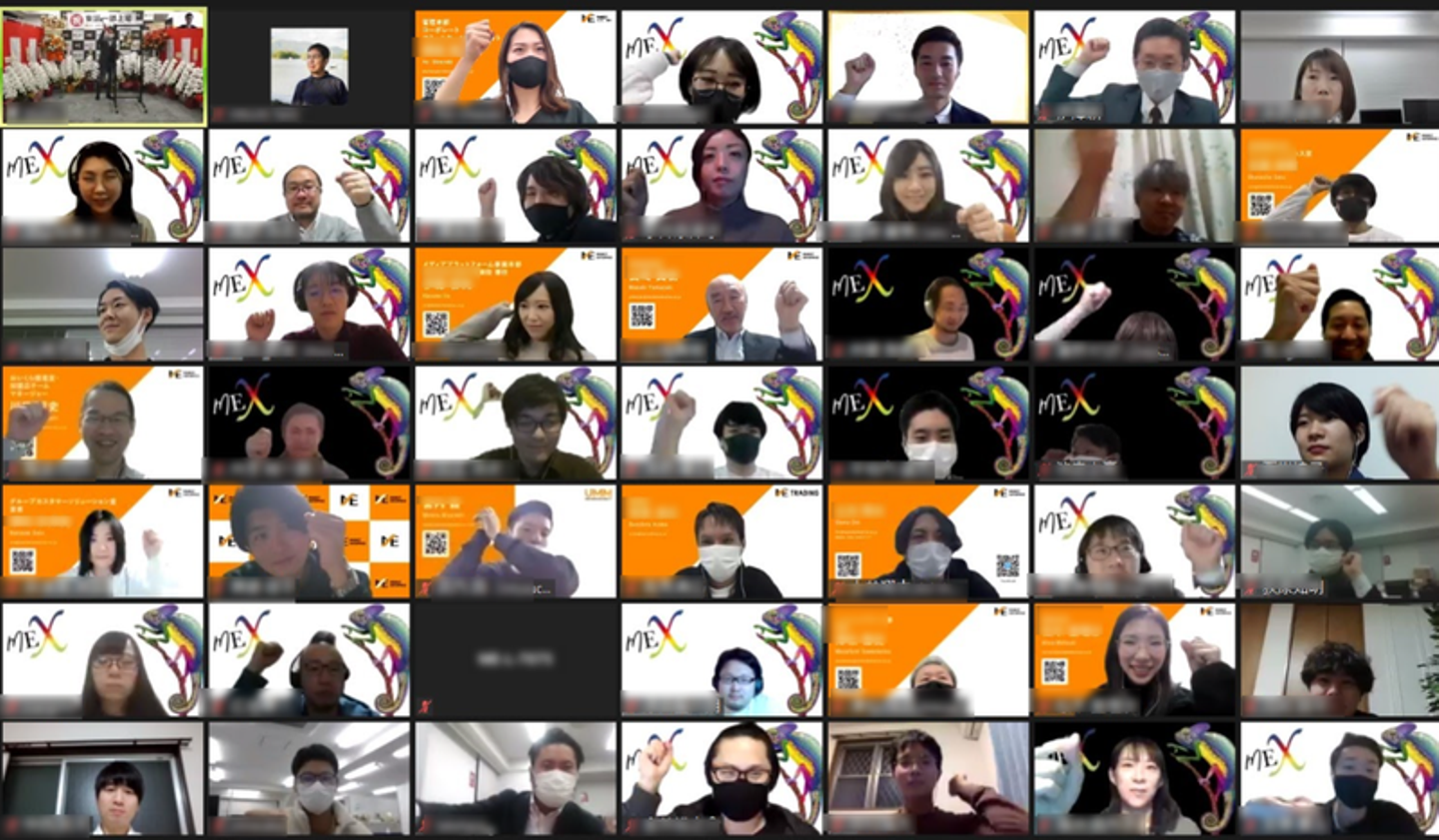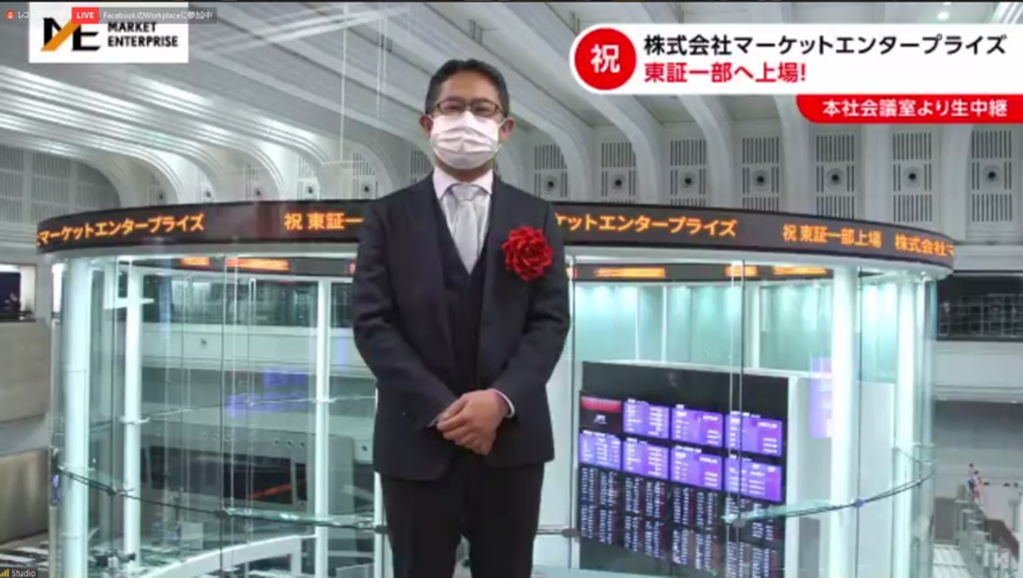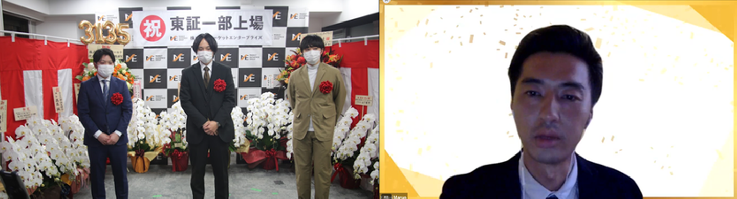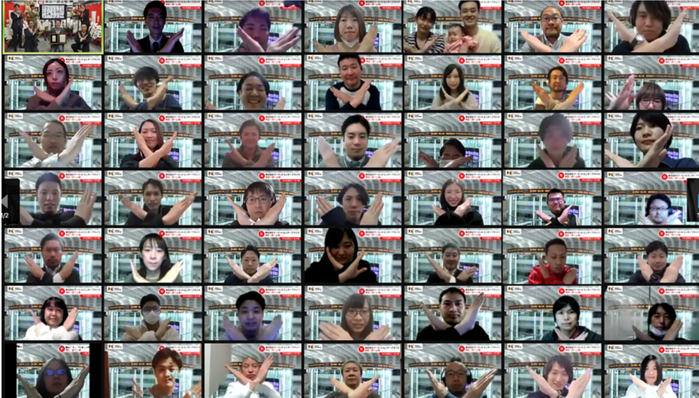 マーケットエンタープライズグループ(以下、ME)は、2021年2月16日に東証一部へ上場し、創業当時から掲げていたビジョンの一つを達成しました。緊急事態宣言下での上場市場変更となったため、残念ながら東京証券取引所での市場変更セレモニーは中止でしたが、晴れの日を祝うべく、社内で上場セレモニーを実施。国内16拠点・海外1拠点で働くメンバーに参加してもらえるよう、オンラインで開催しました。