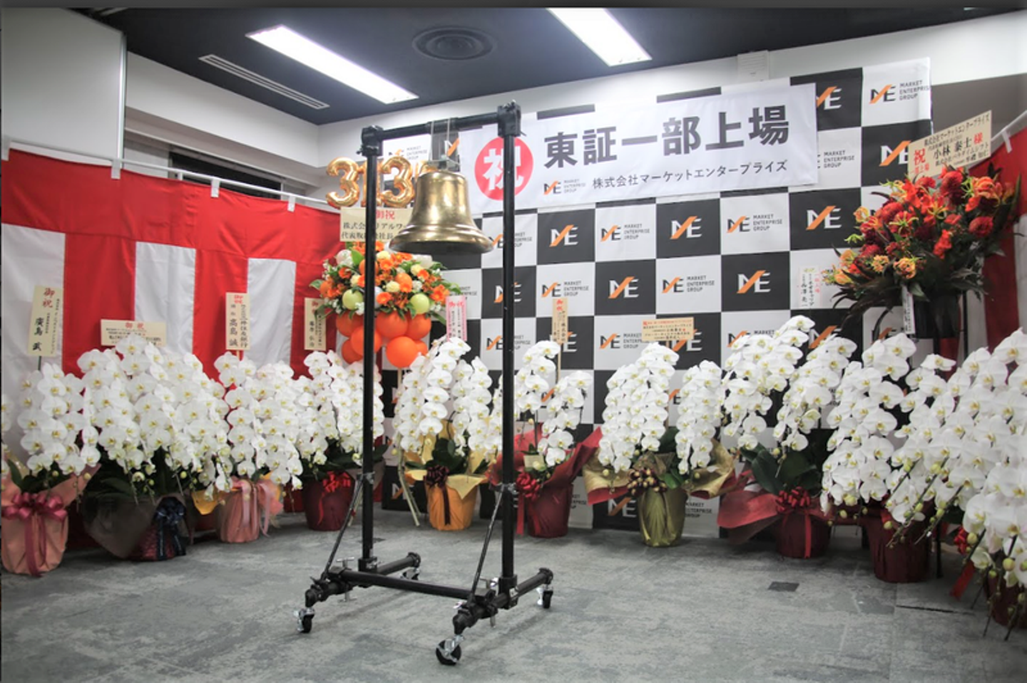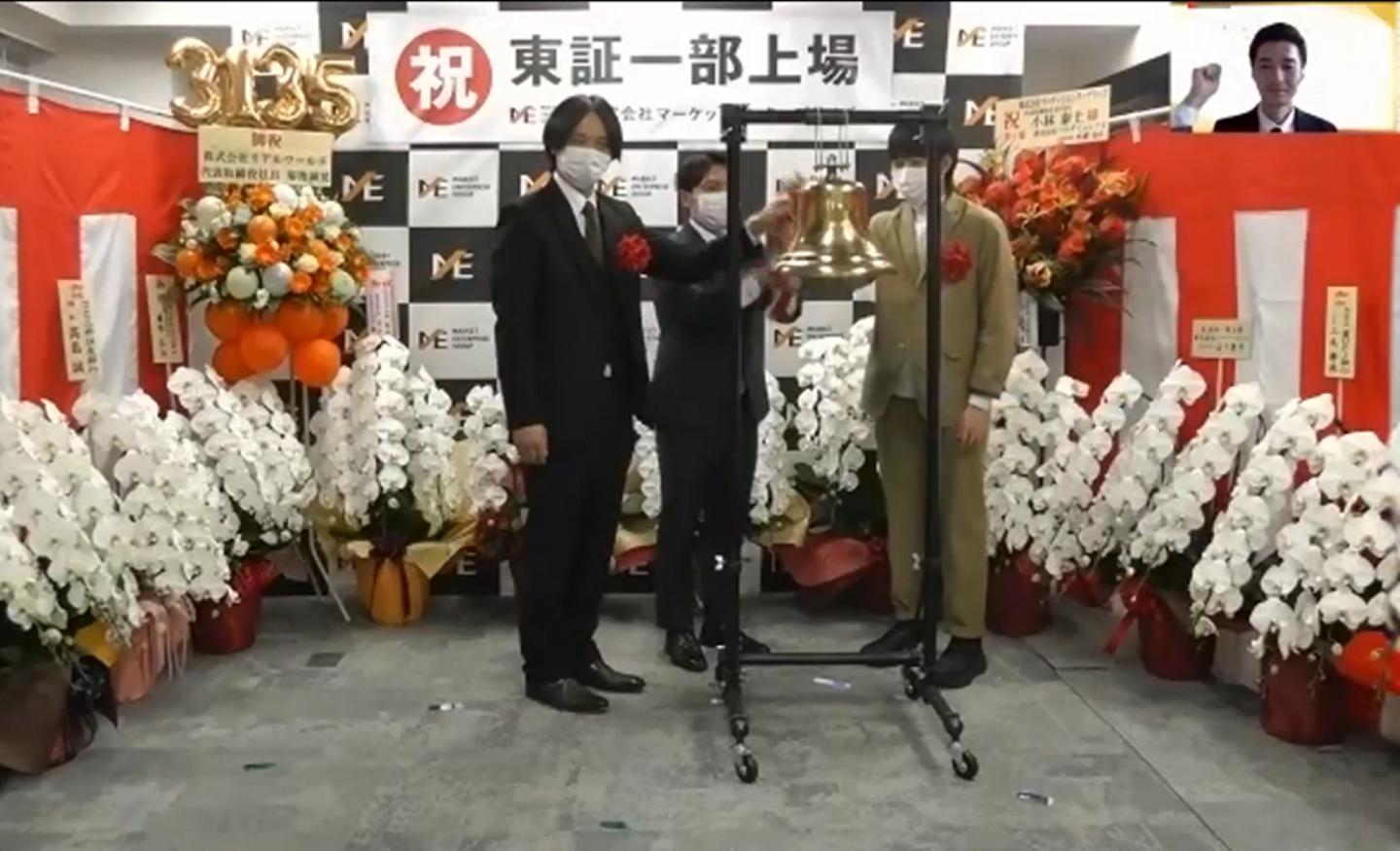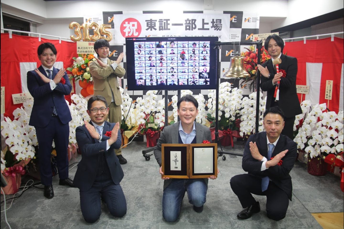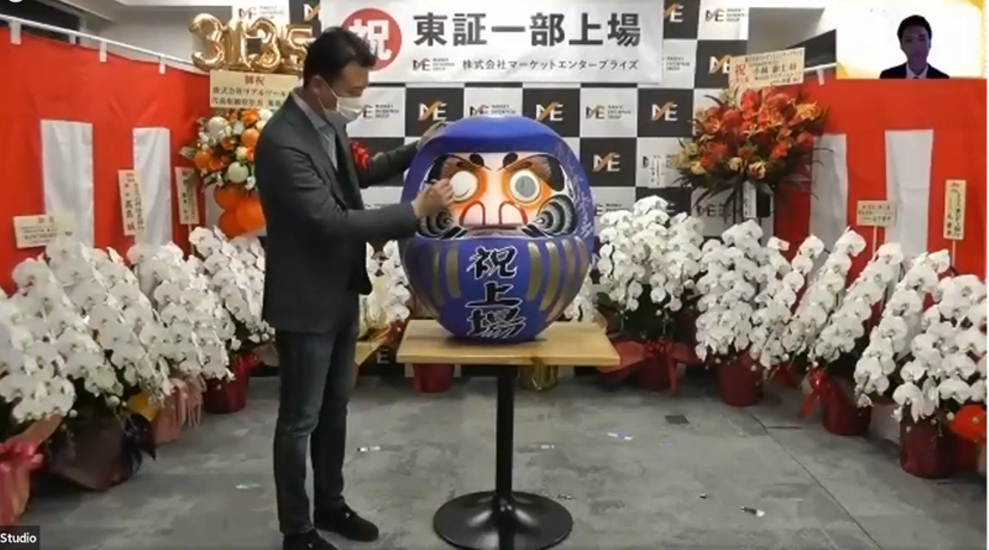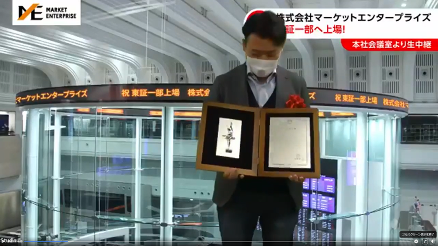 マーケットエンタープライズグループ(以下、ME)は、2021年2月16日に東証一部へ上場し、創業当時から掲げていたビジョンの一つを達成しました。緊急事態宣言下での上場市場変更となったため、残念ながら東京証券取引所での市場変更セレモニーは中止でしたが、晴れの日を祝うべく、社内で上場セレモニーを実施。国内16拠点・海外1拠点で働くメンバーに参加してもらえるよう、オンラインで開催しました。