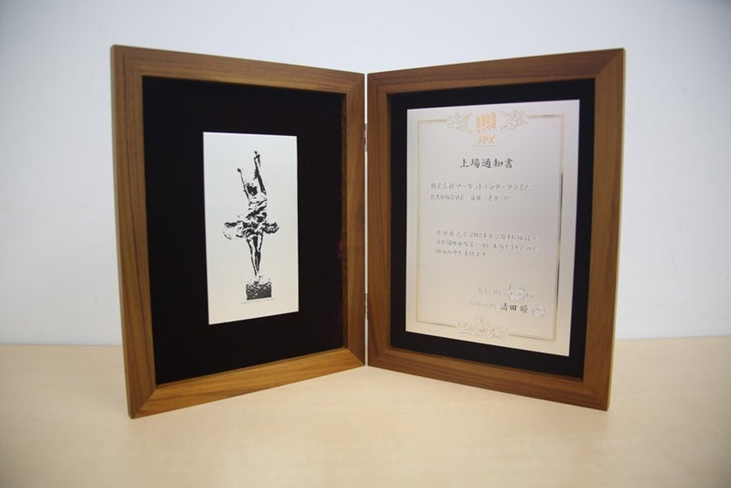 上場通知書のエッチングは、東京証券取引所東口玄関ホールに設置されているブロンズ像「讃太陽」をデザイン化したもので、「讃太陽」は、女性が衣をなびかせ、太陽を讃美する姿を表現しているそうです。
