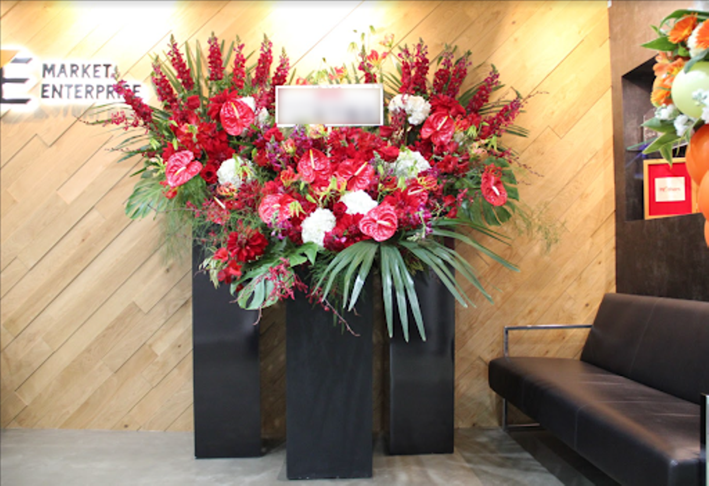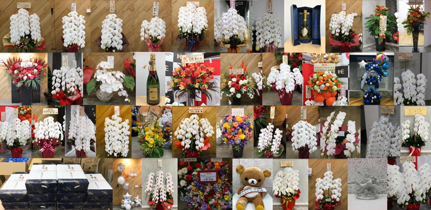 上場のお祝いということで、たくさんのお祝いの品をいただきました。お花はもちろん、風船やビール、かわいいぬいぐるみもいただき、エントランスがとても華やかになりました。