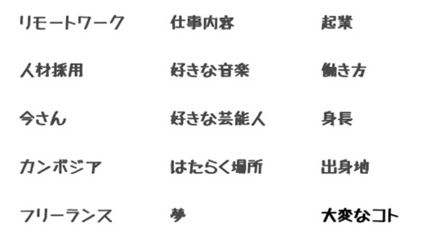 仕事内容→好きな芸能人→リモートワーク→今さん→カンボジア→働き方