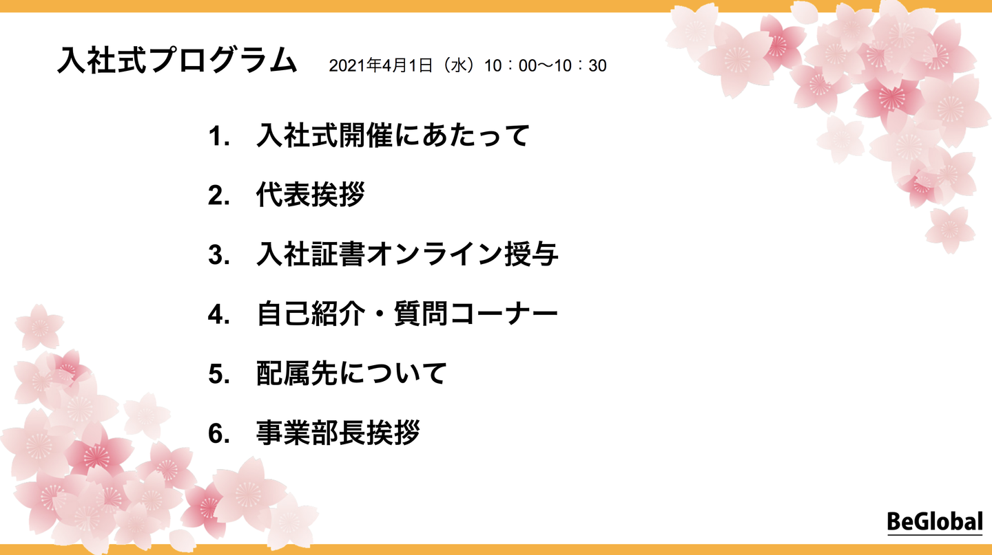 2021年4月1日、BeGlobalの新卒1期生のオンライン入社式を行いました!