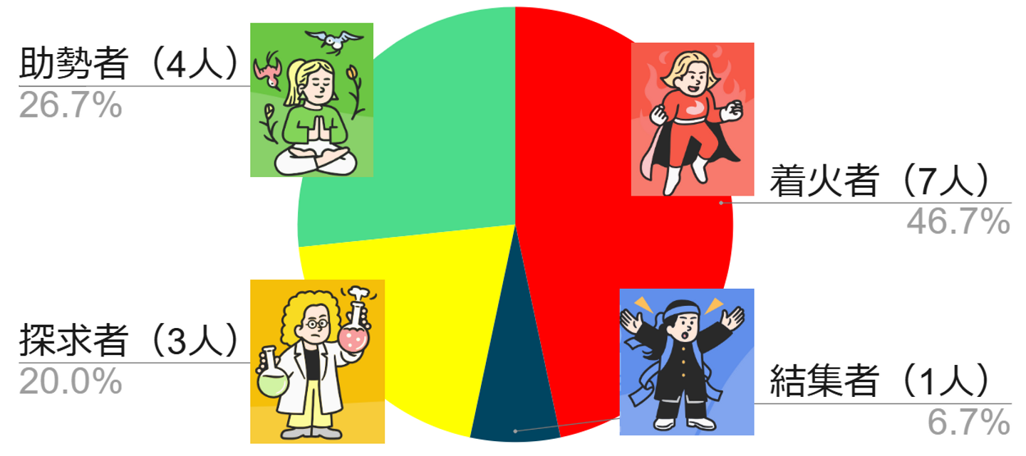 チームに変化をもたらす探究家。 感性と信念をもとに、我が道を突き進み、チームに活気を与えます。争いを好まず、マイペースにチームに貢献しようとします。