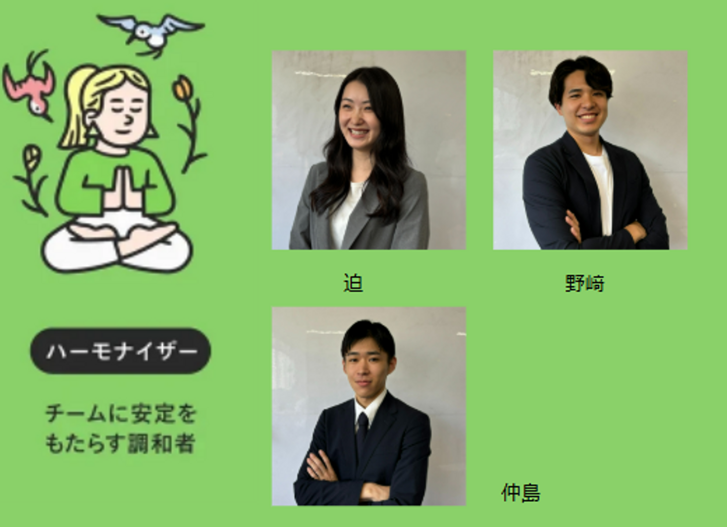 仲島:周りの意見を尊重し、グループの和を乱さないようにする系。だが飲み会では周りをめちゃくちゃ楽しませてくれる。笑