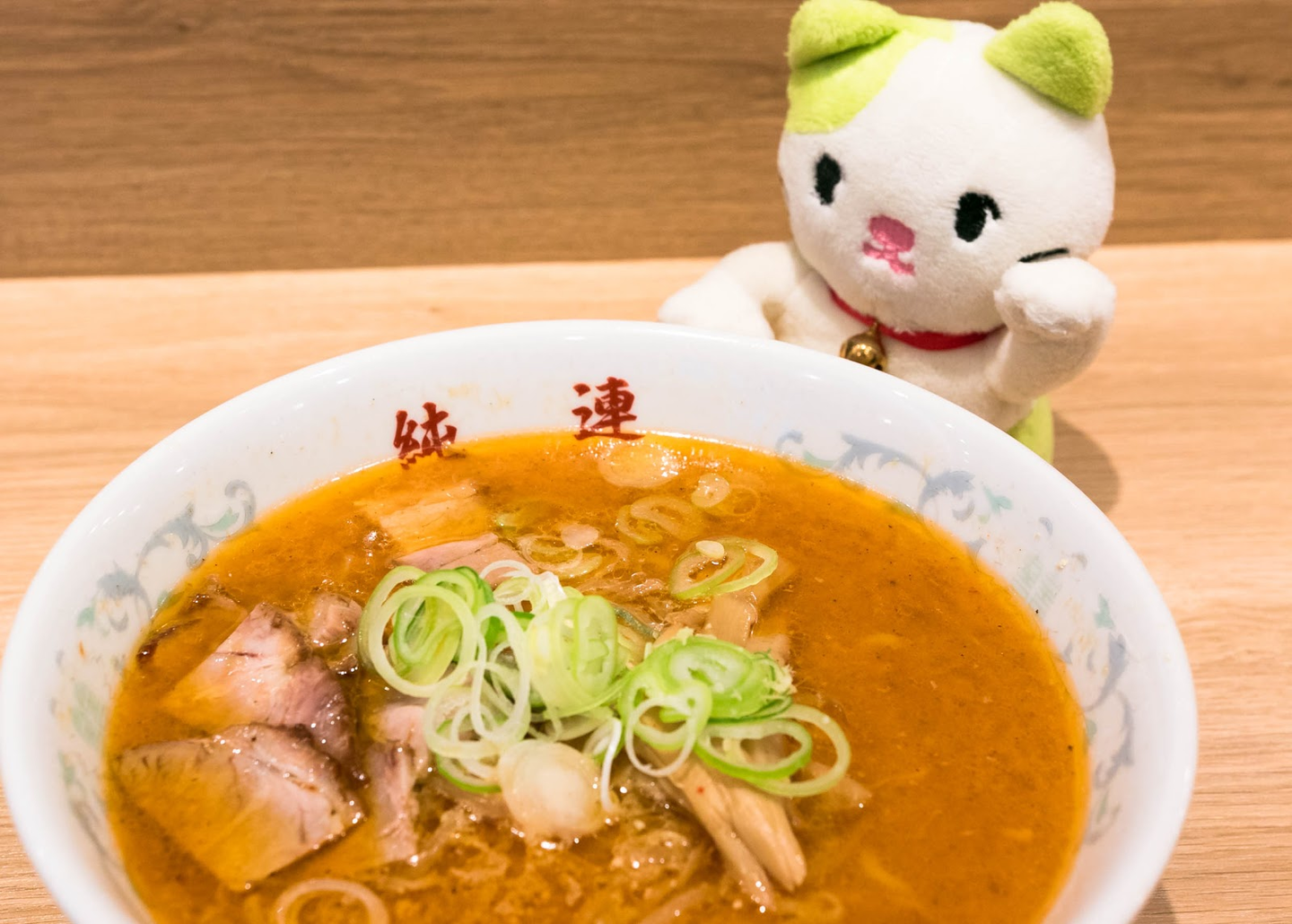 写真:神谷が「ここの味噌ラーメンが宇宙一うまい!」と語る札幌・純連のラーメンと、弊社のマスコットまっちゃん
