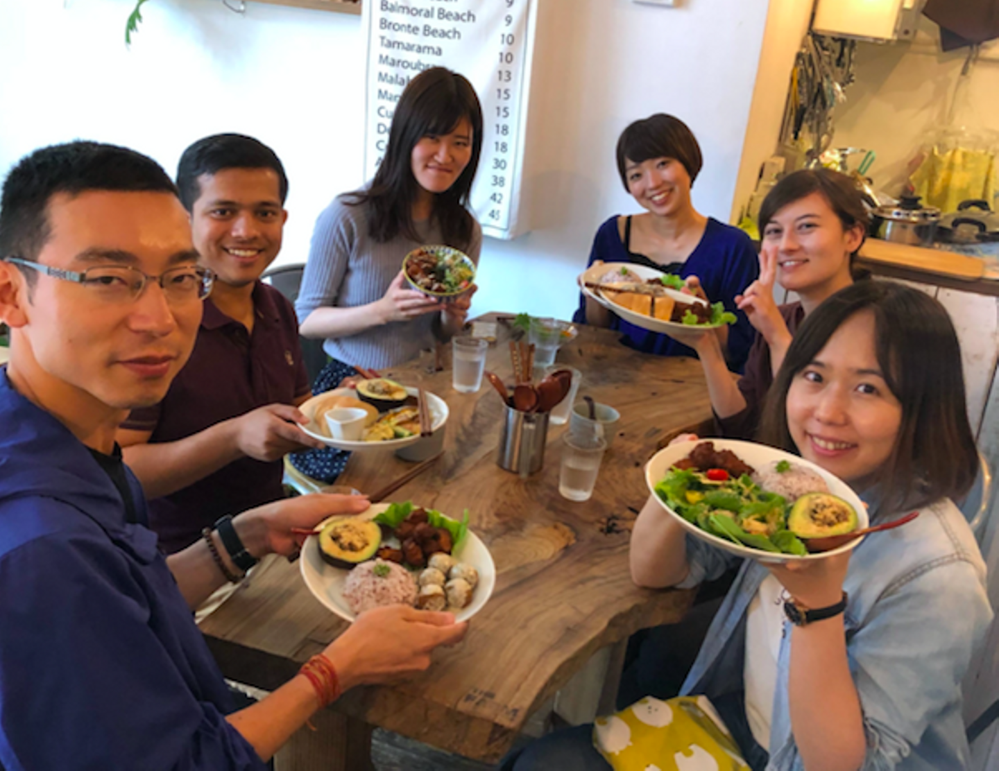 オフィスから歩いていける隅田川沿いのヴィーガンカフェ「THE FARM CAFE」でランチ。ピースをする部長のジャスミン。エンジニアでムスリムのスフィアン(左から2人目)も楽しそう!